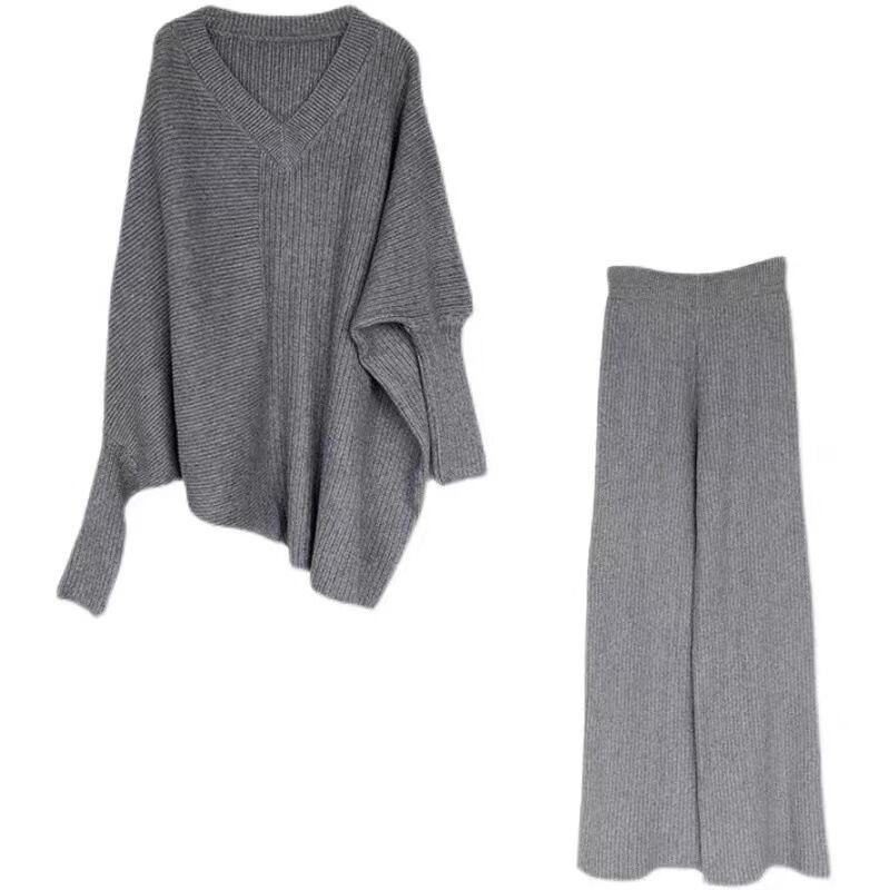 ◎【送料無料】ニットセーター ワイドパンツ 2点セット 韓国 不規則 トップス 長袖 体型カバー 厚手 レディース