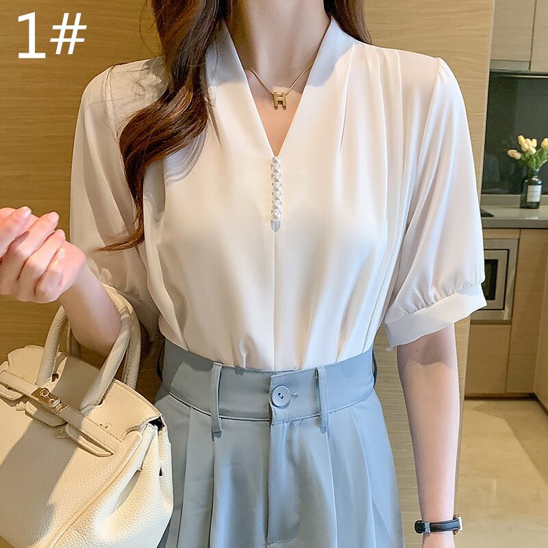 ◎【送料無料】2022春夏新作 半袖 シフォンブラウス パール付き Vネック レディース おしゃれ 着回し