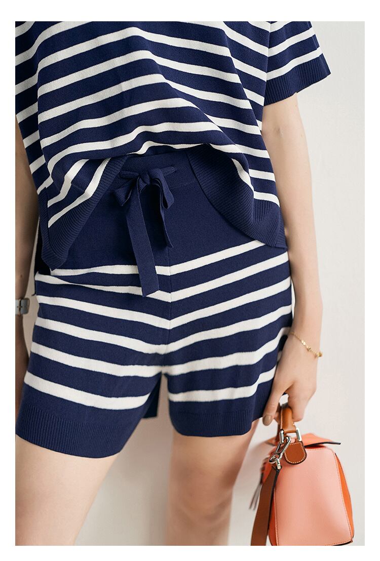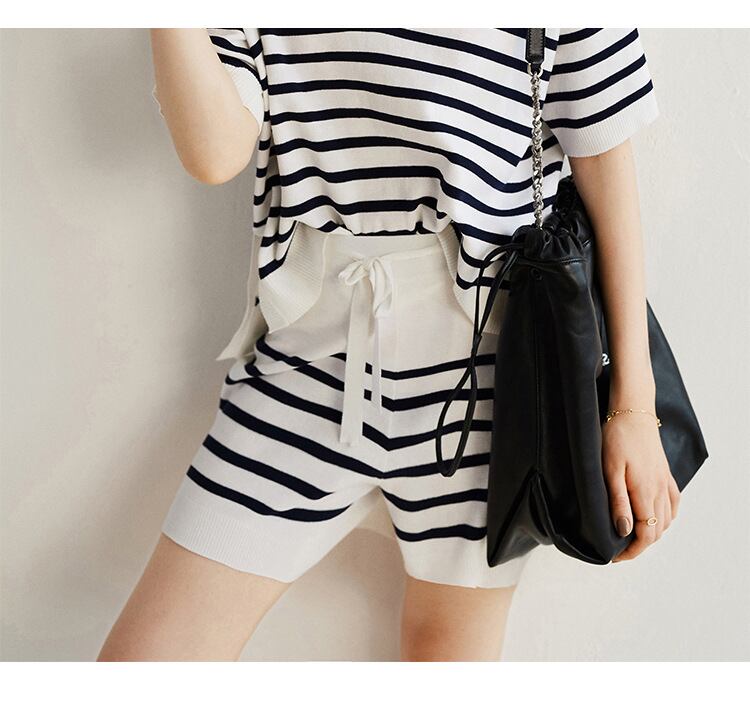◎【送料無料】2022春夏新作 カットソー ショートパンツ 2点セットアップ ストライプ柄 半ズボン カジュアル 大人可愛い