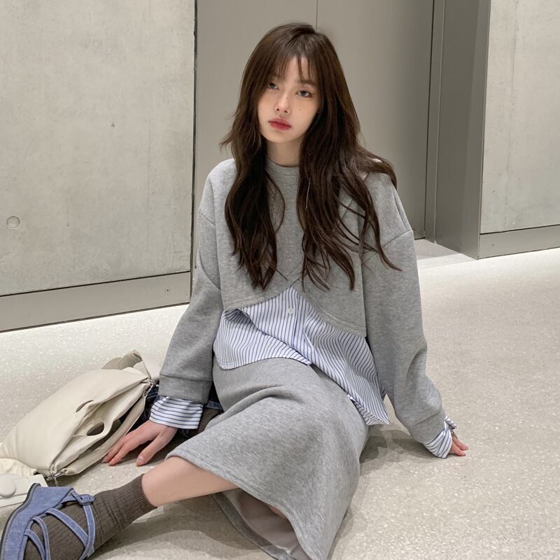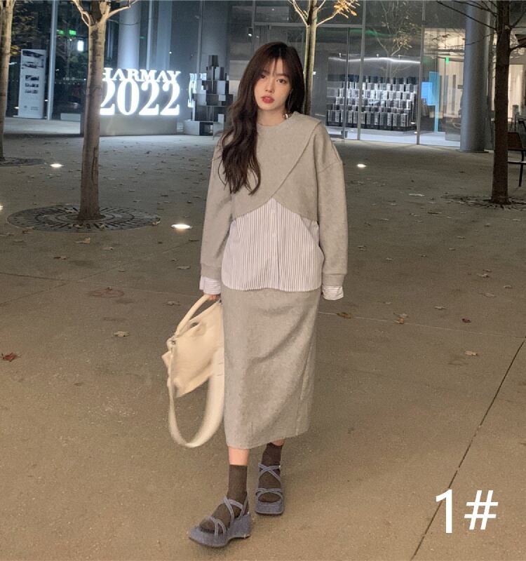 ◎【送料無料】2022春新作 プルオーバー ロングスカート 2点セットアップ フェイクレイヤード 韓国風 カジュアル