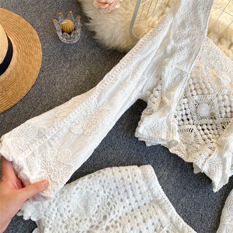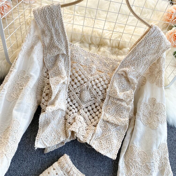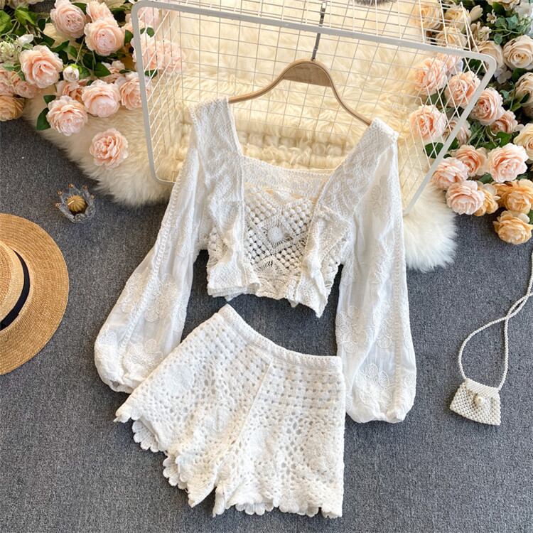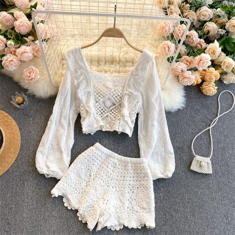 ◎【送料無料】透かし彫り ショートパンツ 可愛い 2点セット パフスリーブ トップス ハイウエスト