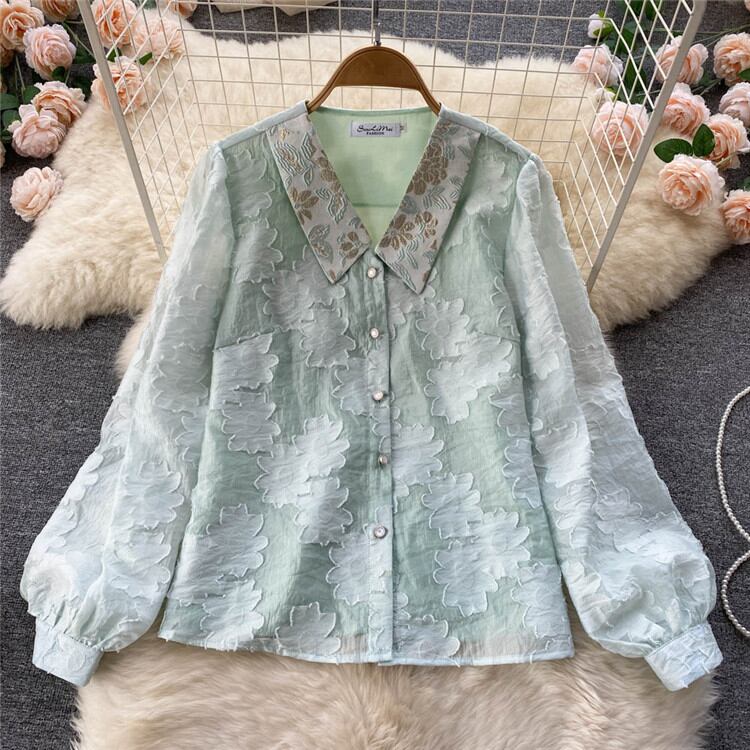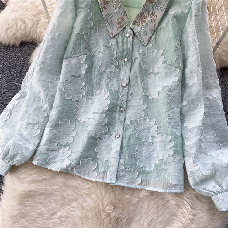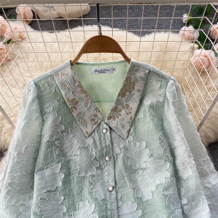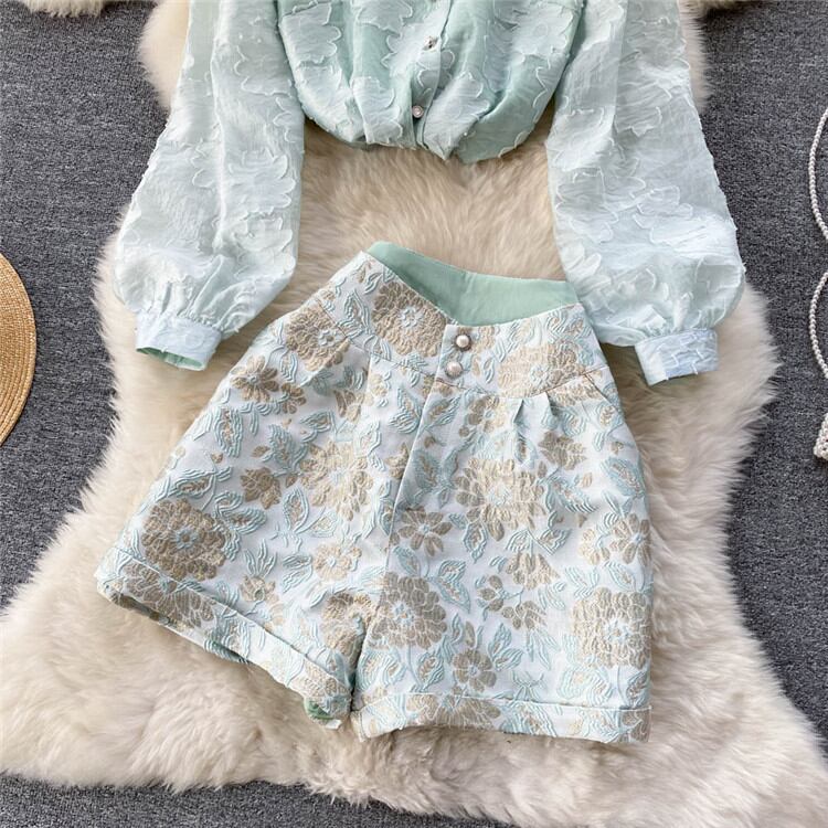 ◎【送料無料】レトロ プリント シャツ ショートパンツ 2点セット 新作 気質 ランタンスリーブ
