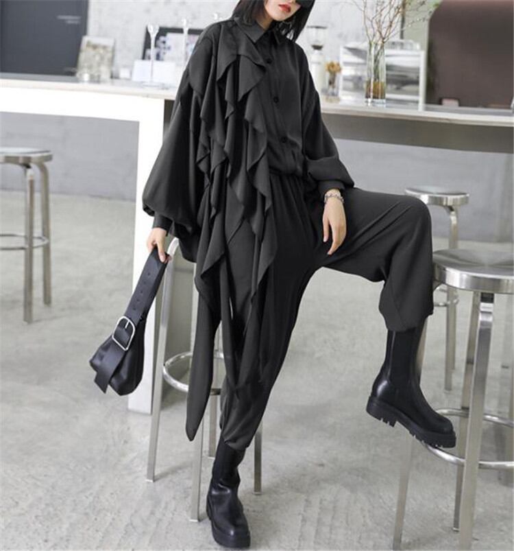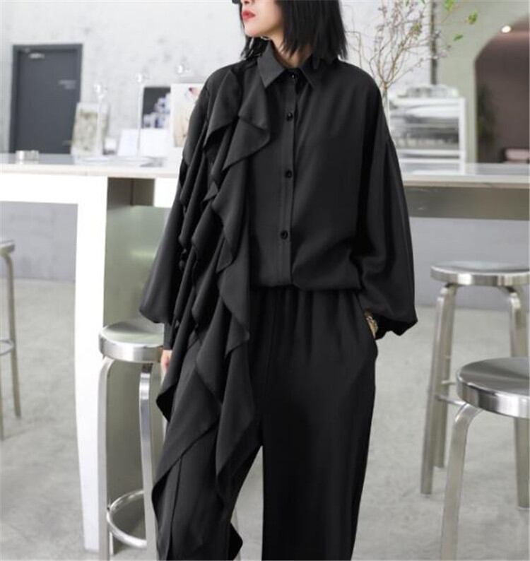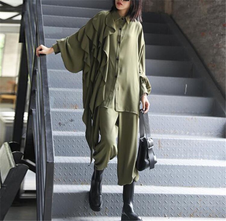 ◎【送料無料】ピュアカラー 減齢 シャツ ワイドパンツ レトロ レディース 2点セット 長袖