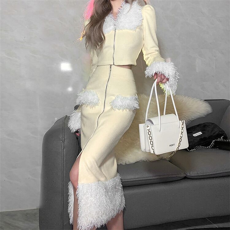 ◎【送料無料】気質 セット ハイウエスト 中・長セクション スカート ジッパー ぬいぐるみ コート