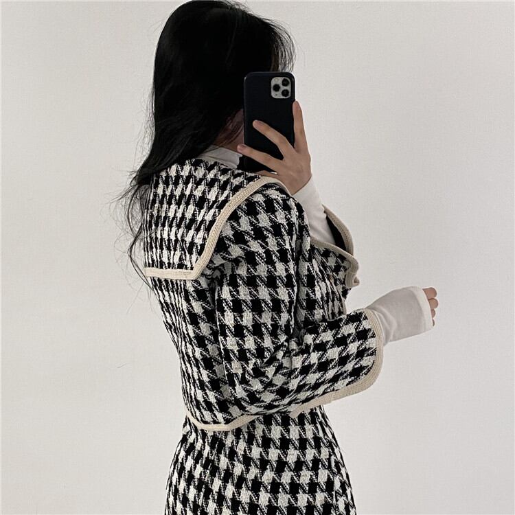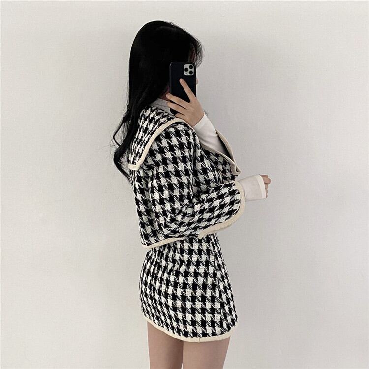 ◎【送料無料】着映えが狙える レトロ 短いスタイル 千鳥格子 コート スカート 2点セット オシャレ 大人気