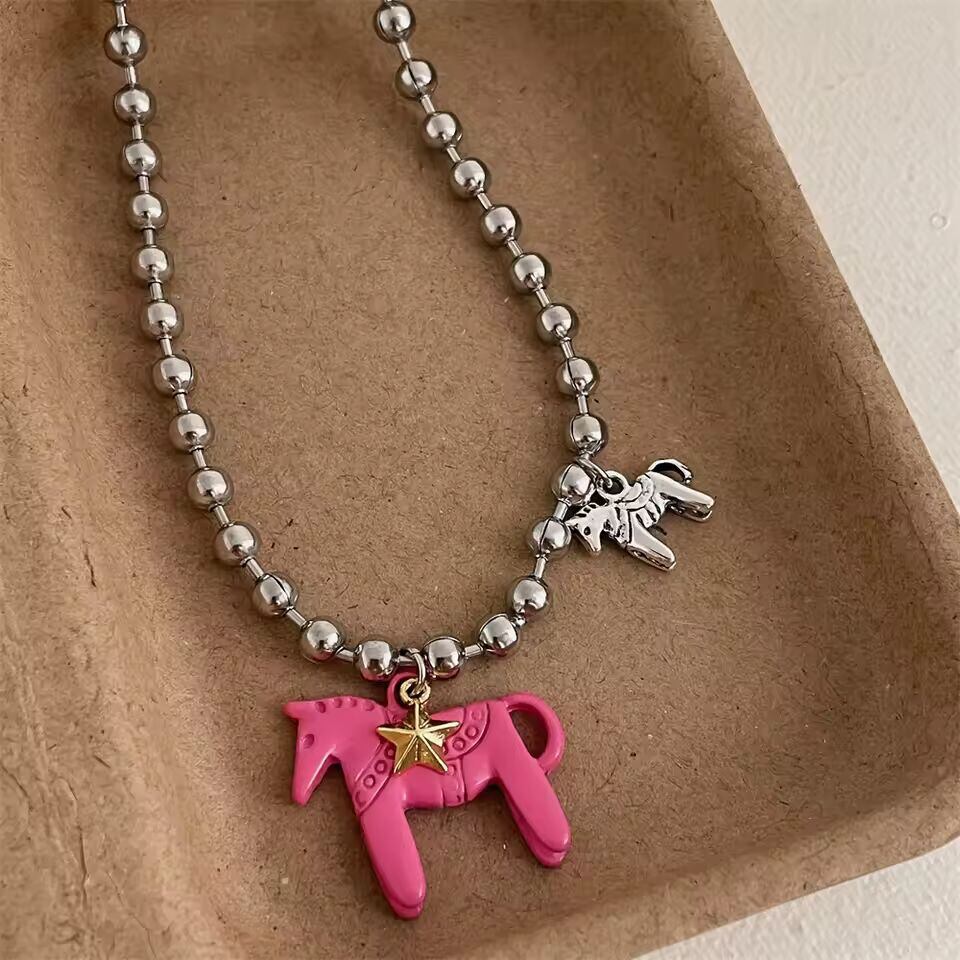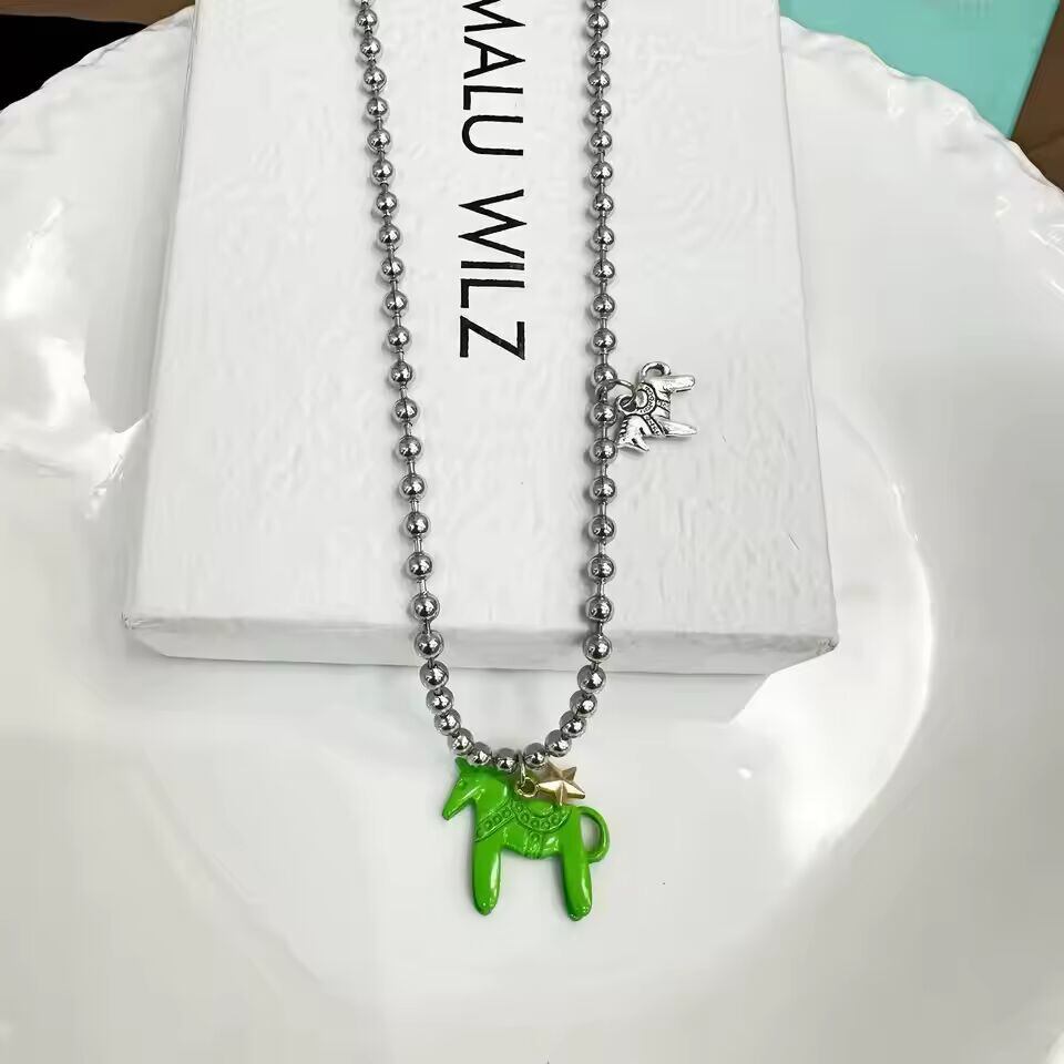 【送料無料◎】 LATS ホワイト、ブラック、グリーン、ブルー、ピンクカラーエナメルコルト馬ペンダントネックレス女性のためのシルバーメッキ合金ビーズチェーンチョーカー