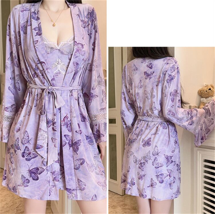蝶々プリント ナイトウェア 2点セット ノーバックディープVワンピース+ローブ