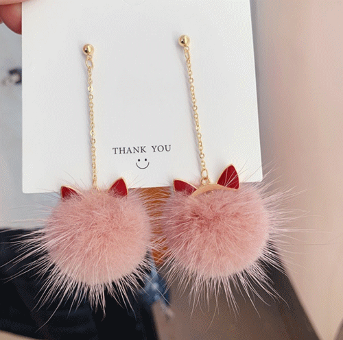 ◎【送料無料】ピアス 秋冬 アクセサリー ジュエリー 猫耳 ファーボール ボンボンチャーム ぽんぽん レディース チェーン