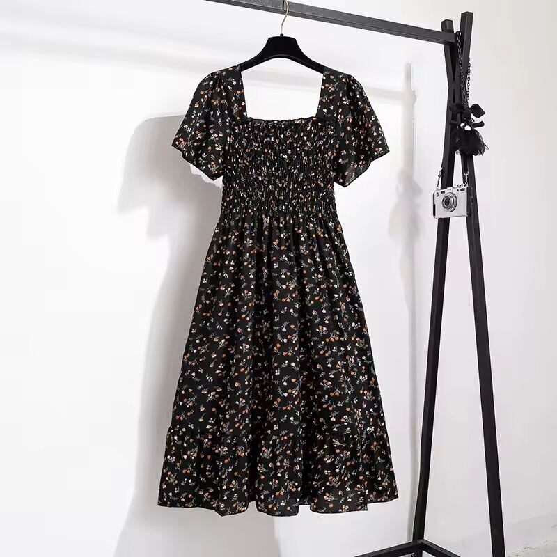 【送料無料◎】 春夏シフォンドレス女性ミディドレス女性半袖弾性ウエストプリント花プリーツバックレスカジュアルドレス