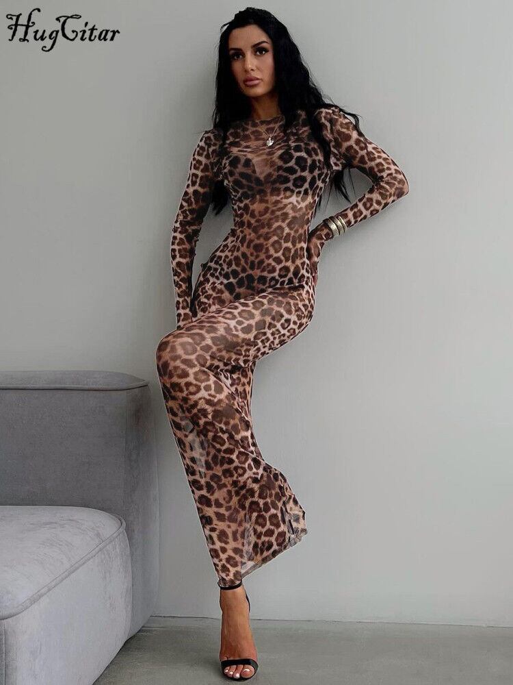 【送料無料◎】 Hugcitar ヒョウ柄メッシュ長袖セクシーなスリムシースルーマキシドレス秋の女性のファッション衣装ビーチ休暇クラブ