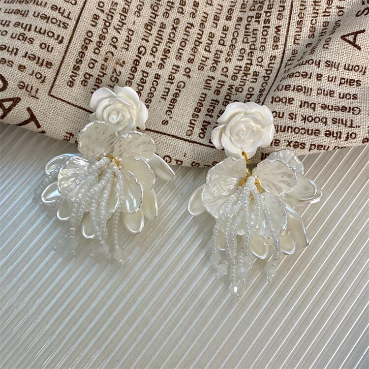 フランス風の雰囲気と手作りの温かみがあるピアスです。白い貝殻の花デザインが柔らかい印象を与え、少し大きめのサイズが高級感を増します。两戴きで様々な服装に合わせられ、花嫁様だけでなく、特別な日を過ごしたい方にもおすすめです。∽注意事項∽