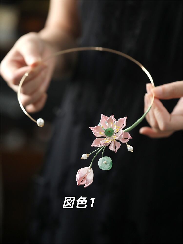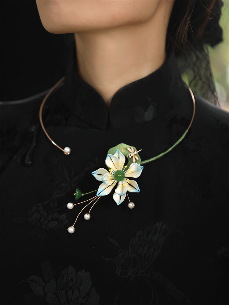 手編みの缠花が施されたこの項圈は、ちょっと特別な一日にもぴったり。蓮の花のモチーフが優しく印象を柔らかくし、シンプルな服装にも合わせやすいデザイン。一つひとつ手作りなので、同じものはありません。重ね付けや単体での着用も自由自在です。∽注意事項∽