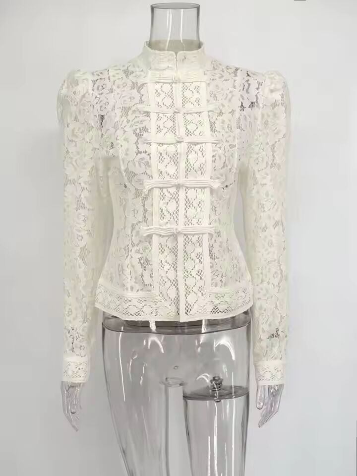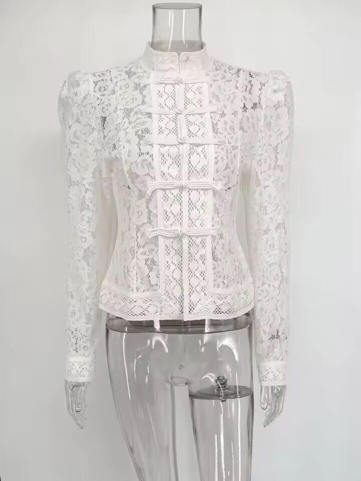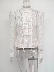 【送料無料◎】 Tossy 夏レースプリントシャツトップス女性中空アウトファッション通勤ヴィンテージシースルーブラウス女性のレースすくめシャツ新
