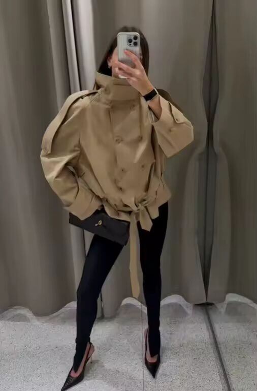 【送料無料◎】 カジュアルカーキレースアップトレンチコート女性シックなスタンドカラーダブルブレストルーズショートウインドブレーカー 2026 春女性通勤コート