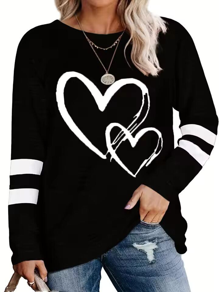 【送料無料◎】 女性用長袖ハート型プリントTシャツ,カジュアルTシャツ,軽量伸縮性アイレット,透かし彫り,ソリッド,ラージサイズ,秋冬