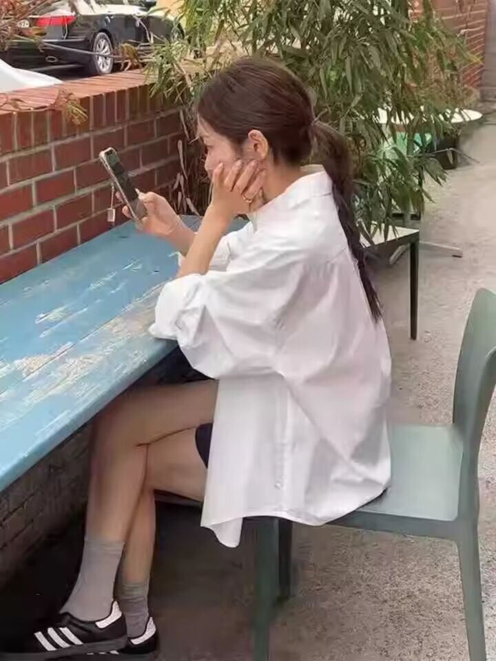 【送料無料◎】 ゆったりとした長袖シャツ レディース 春秋 シンプル エレガンス 韓国風 レイジーフィール ホワイト ポロカラー 通勤スタイル ストレートカット