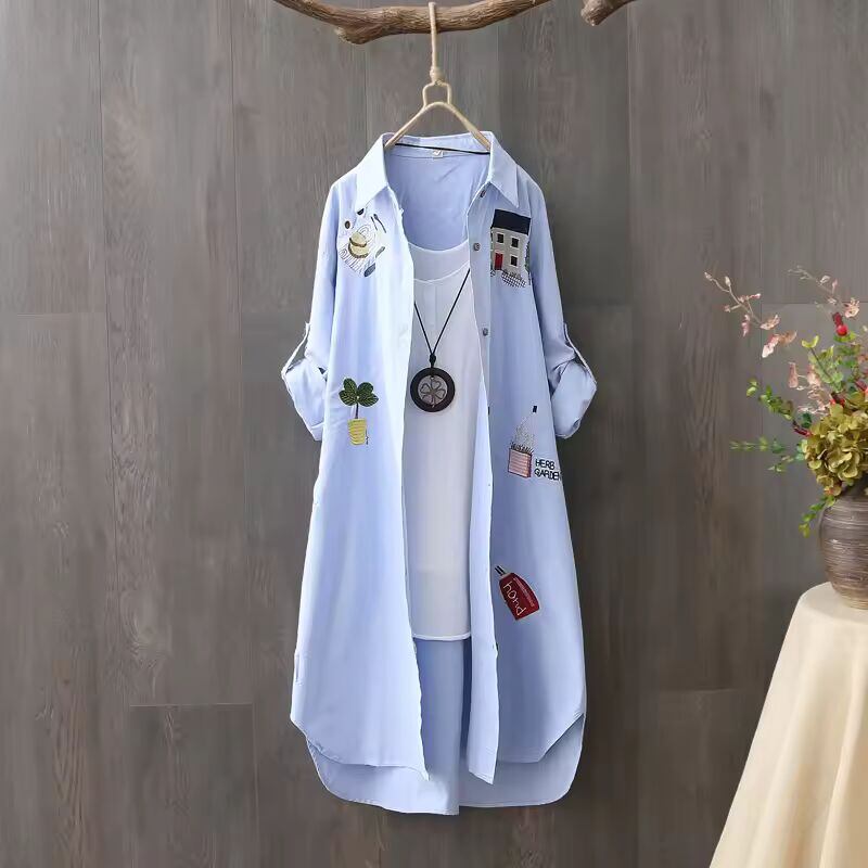 【送料無料◎】 女性綿刺繍ルーズロング白シャツ 2025 春秋の新カジュアルオフィスレディブラウス女性トップルーズシャツ