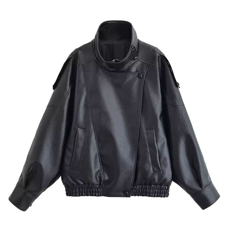 【送料無料◎】 2025年秋新作 レディースジャケット ブラック 長袖 ペブルフェイクレザージャケット バイクスタイル 個性的でおしゃれなデザイン
