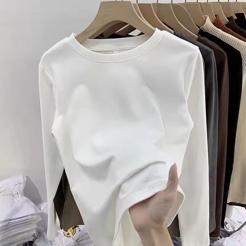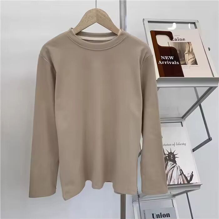 【送料無料◎】 女性のラウンドネックベースシャツフリース裏地付き厚手長袖ピュアカラー痩身インナーウェアTシャツ韓国風通勤ファッション