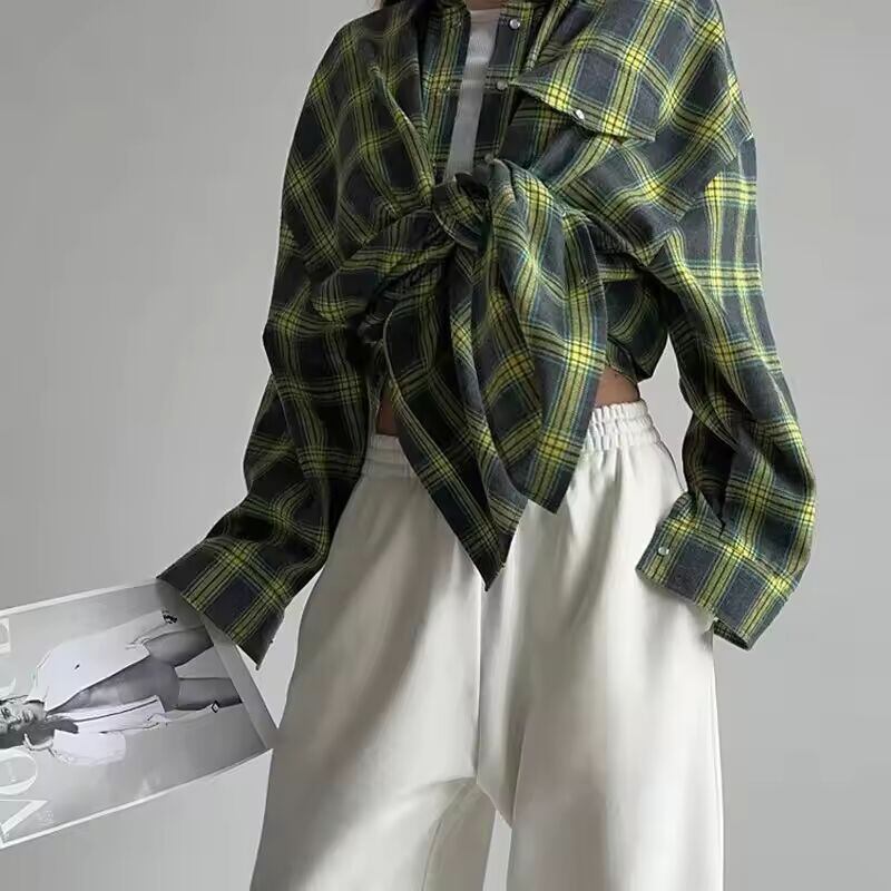 【送料無料◎】 新しいヴィンテージ女性特大長袖チェック柄シャツブラウストップス秋冬ボタンダウンルーズラペルポケットシャツ韓国スタイル