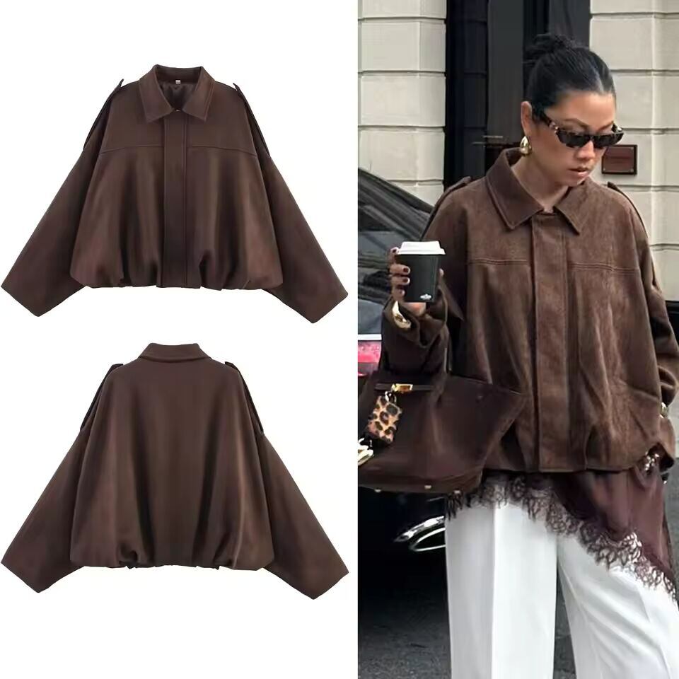 【送料無料◎】 HH レディース ストリートファッション 無地 ルーズ スエード風 コート カジュアル ロング バットスリーブ ラペル ジップフライ 冬 ヴィンテージ ジャケット