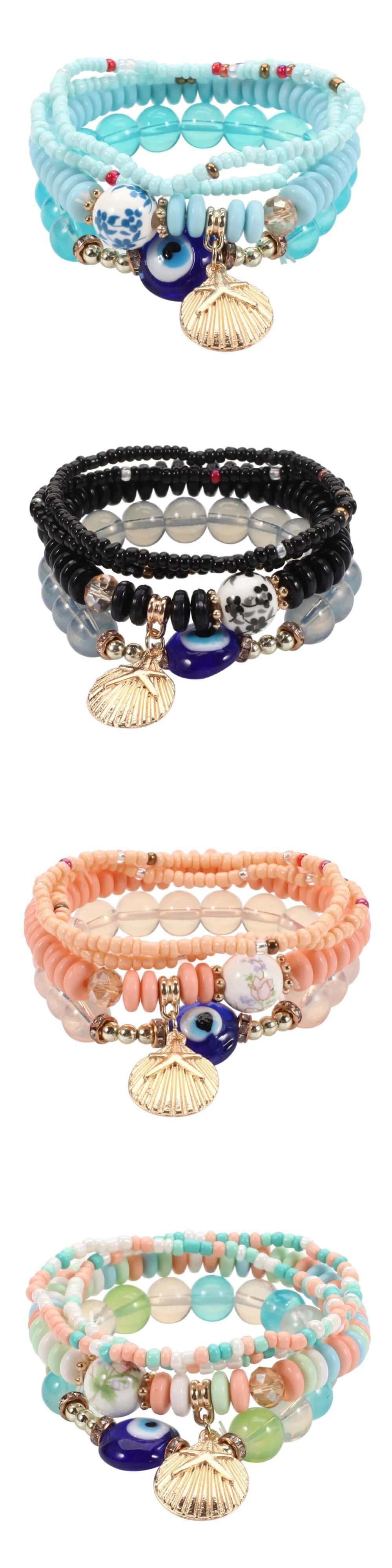 送料無料 1 セットボヘミア多層ビーズ弾性織りブレスレットセット女性ラッキー邪眼シェルビーズコンビネーションブレスレットチャームジュエリー エラスティック 伸縮 マルチレイヤー AE778878816969137263