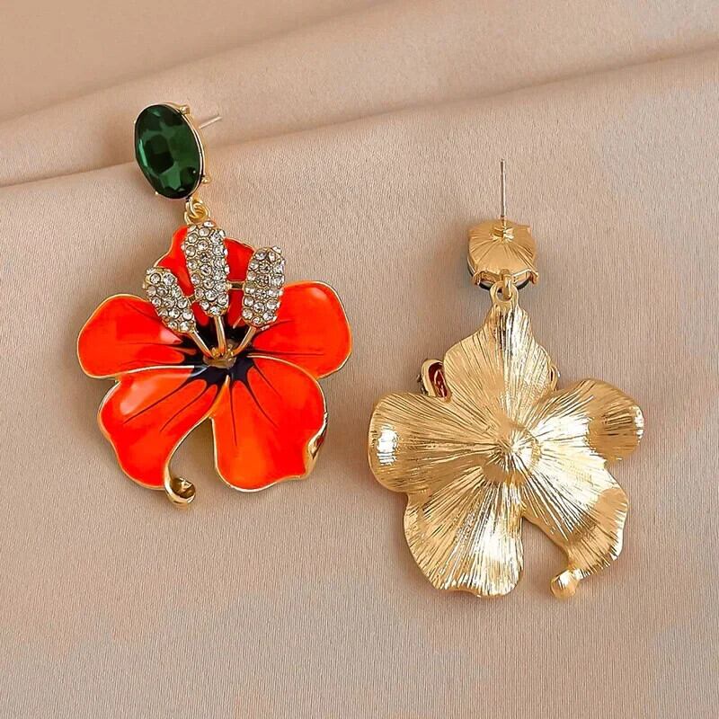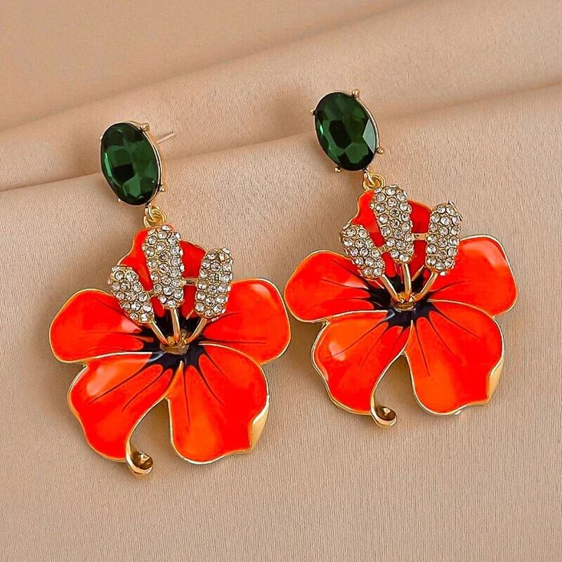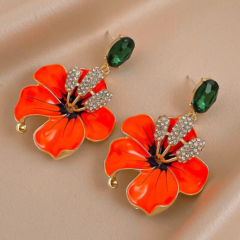 送料無料 オレンジエナメル花イヤリング女性女の子レトログリーンクリスタルブラブライヤリングパーティー誇張ジュエリービジュー 指輪 フラワーデザイン AE778878860822193791