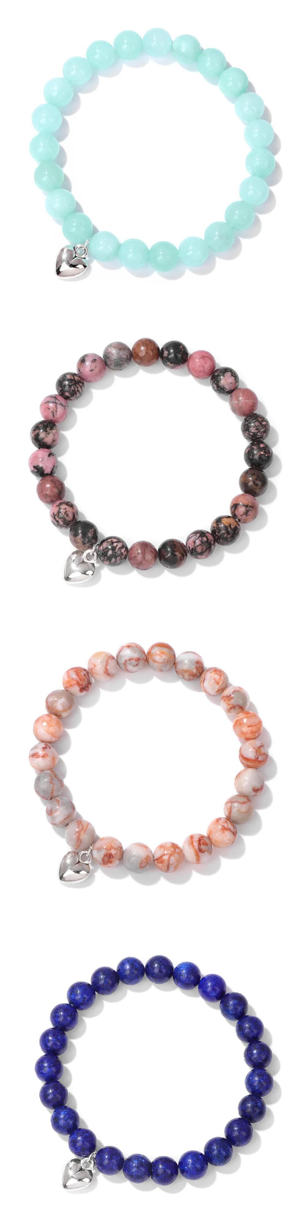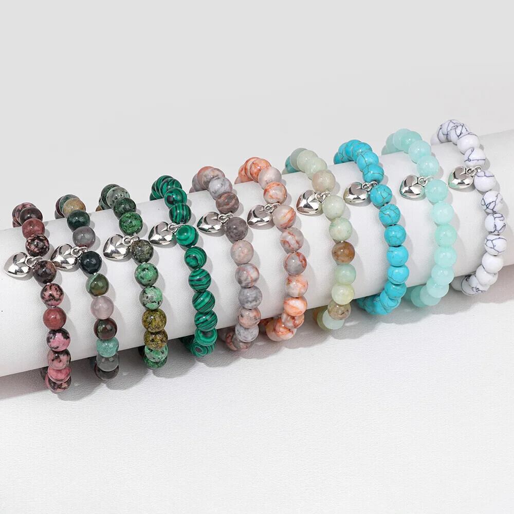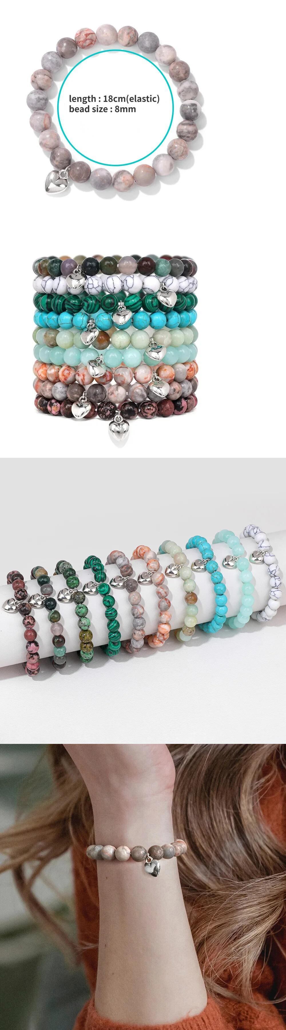送料無料 8 ミリメートル天然石ビーズハートチャームブレスレット女性男性タイガーアイハウライトビーズ弾性ブレスレットバングルカップルジュエリーギフト エラスティック 伸縮 ナチュラル AE778878874878534420