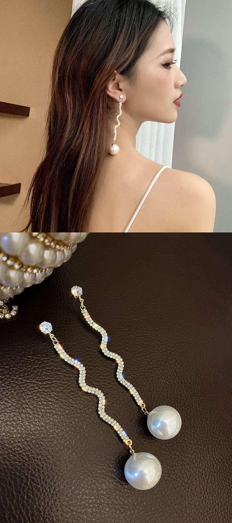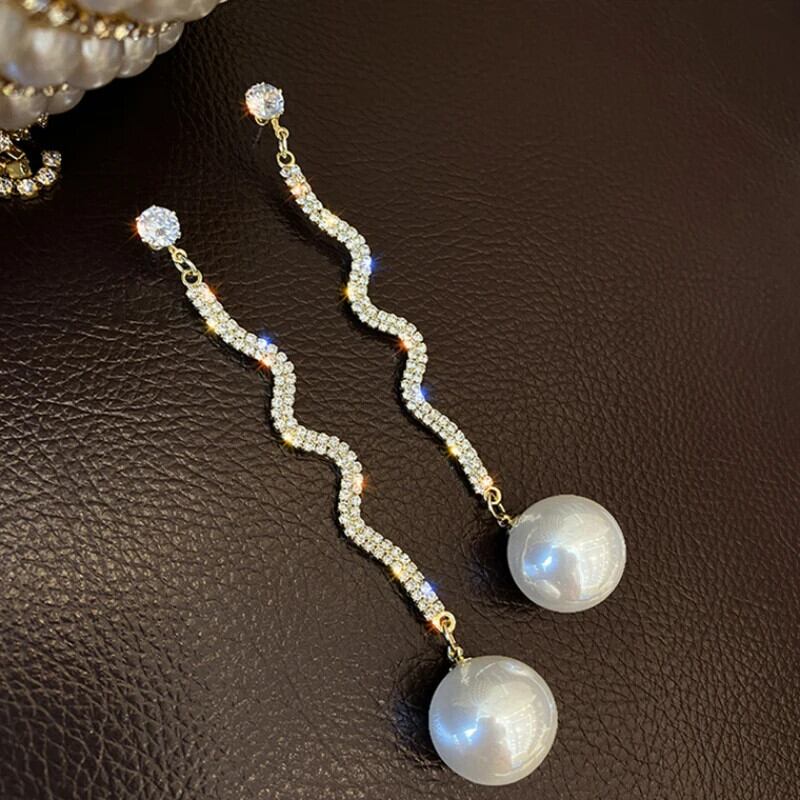 送料無料 フルラインストーンロングテルパールブラブライヤリング女性の高級ジルコンクリスタルイヤリングウェディングパーティージュエリーギフト 真珠 指輪 AE778878872968564368