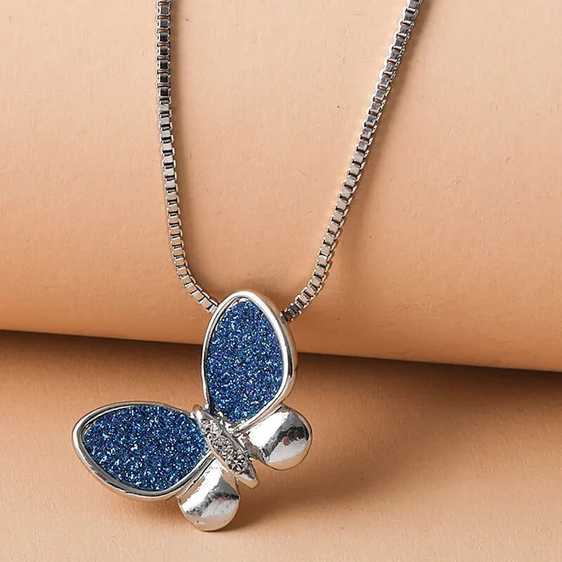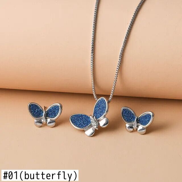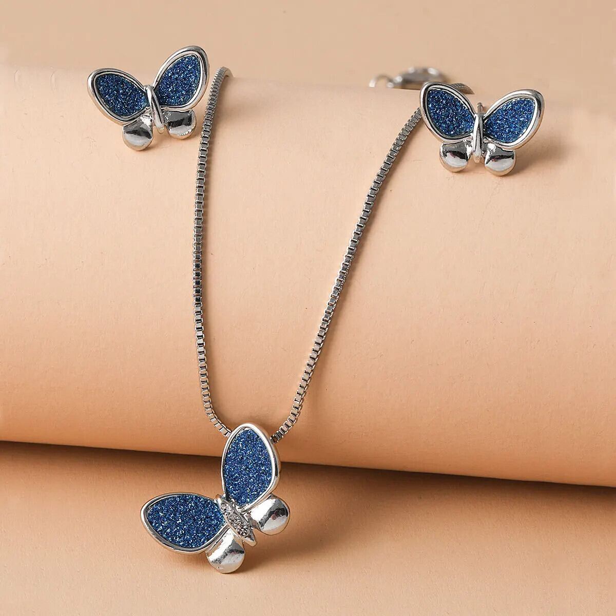 送料無料 絶妙な青い蝶のネックレス & イヤリングフラワーペンダントチョーカー耳スタッドジュエリーセット女性アクセサリー ブルー レース フラワーデザイン AE778878885103029004