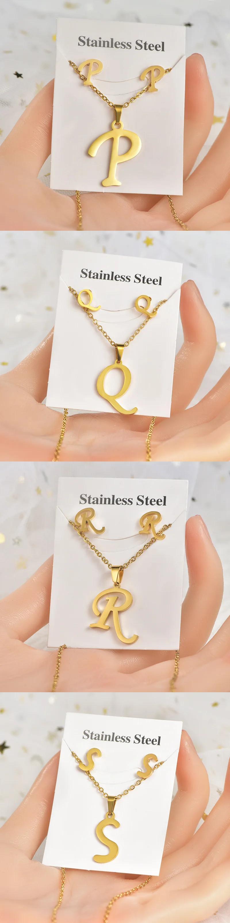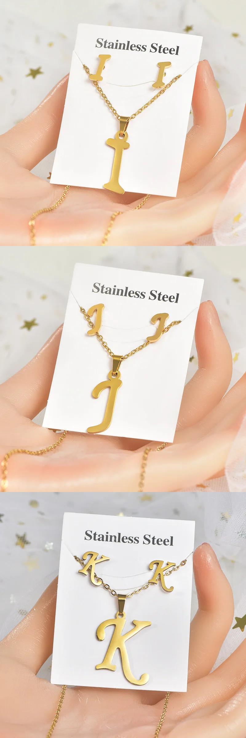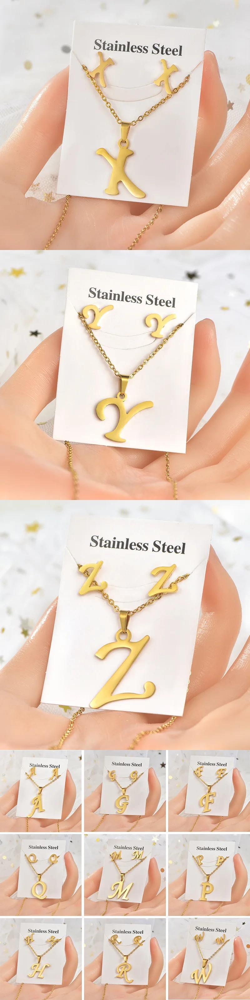 送料無料 A-Z 26 文字イニシャルペンダントステンレス鋼のネックレスイヤリング女性チェーンスタッドイヤリングジュエリーセット名アルファベットチョーカー レース AE778878822025947923