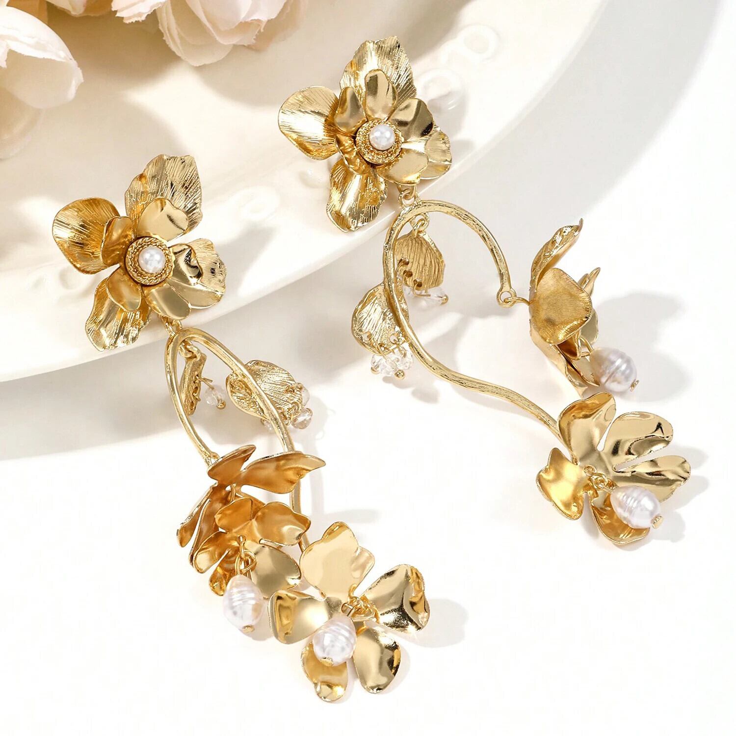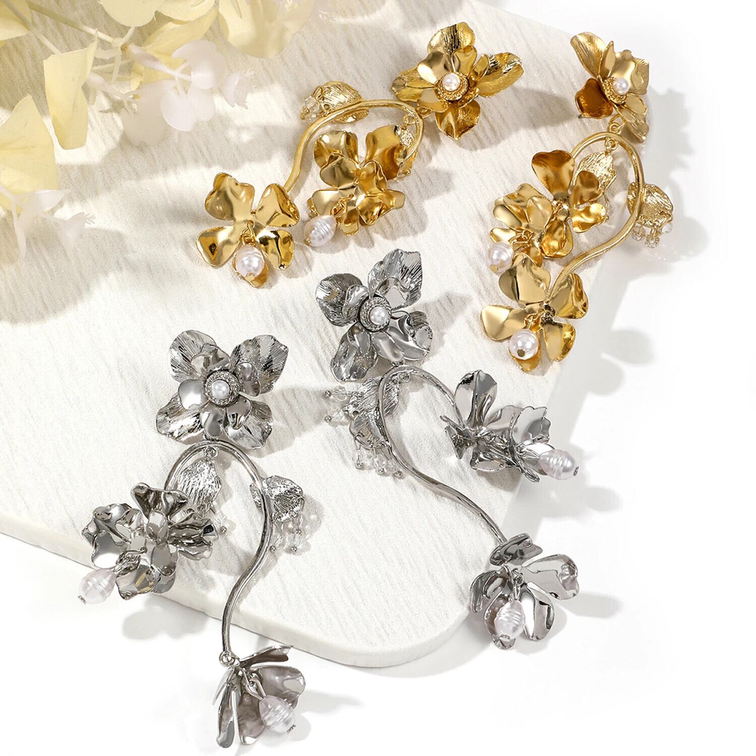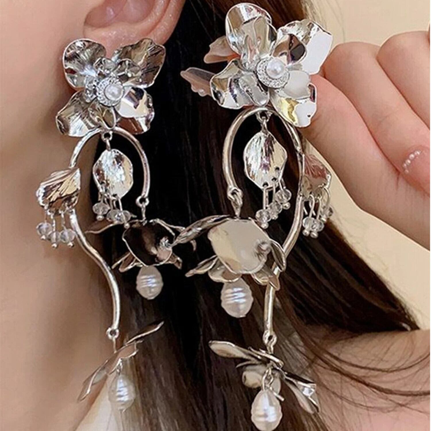 送料無料 誇張された花ブラブライヤリング女性模造パールロング電話イヤリングステートメントパーティージュエリーアクセサリーギフト 真珠 指輪 フラワーデザイン AE778878843770065789