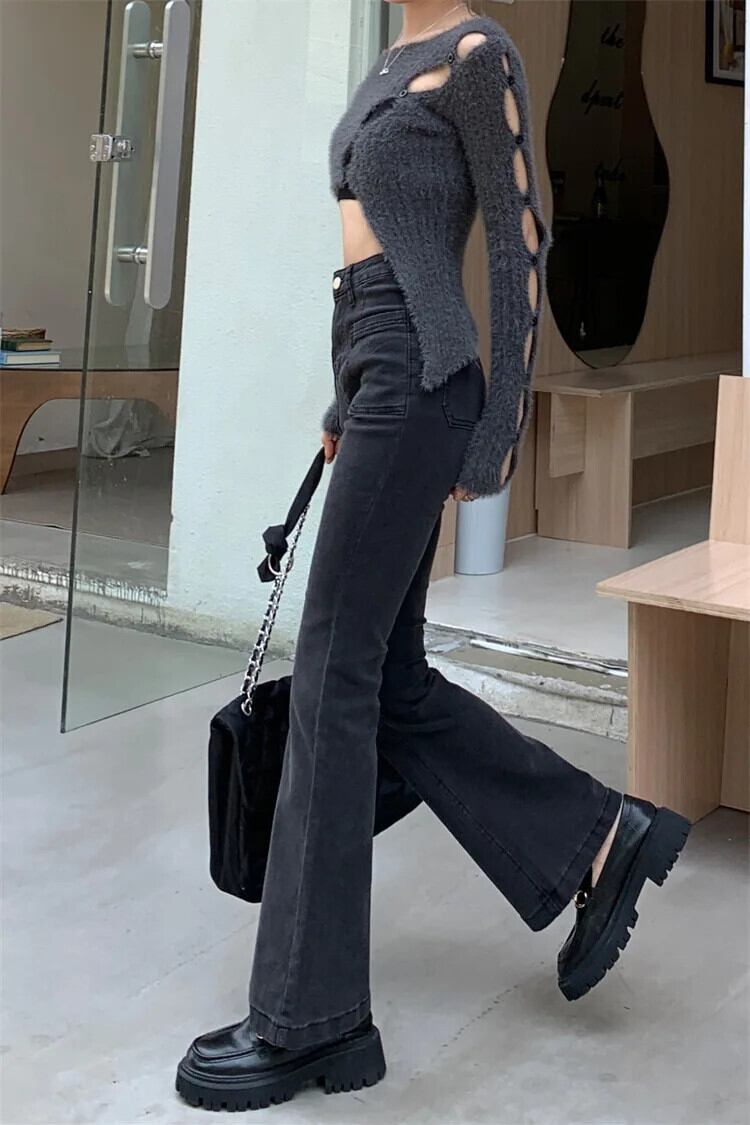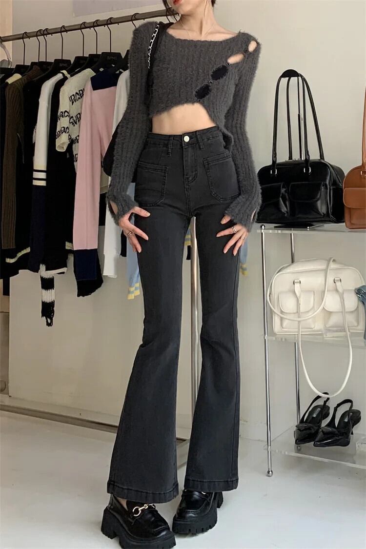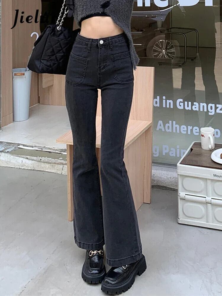送料無料 Jielur 黒ウエストフレアジーンズ秋レトロルーズデニムパンツ女性ストレートジーンズ女性 S-XL ブラック オータム 秋物 AE12188787879294846872