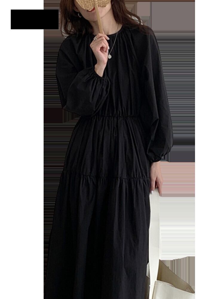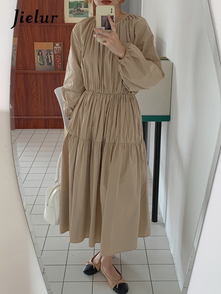 送料無料 Jielur フレンチレトロ無地スリムシックな女性のドレスルーズスウィートレディ女性ドレスブラックホワイトカーキ長袖ドレス ロング 大人ガーリー キュート カジュアル ソリッドカラー AE12188787857856615887