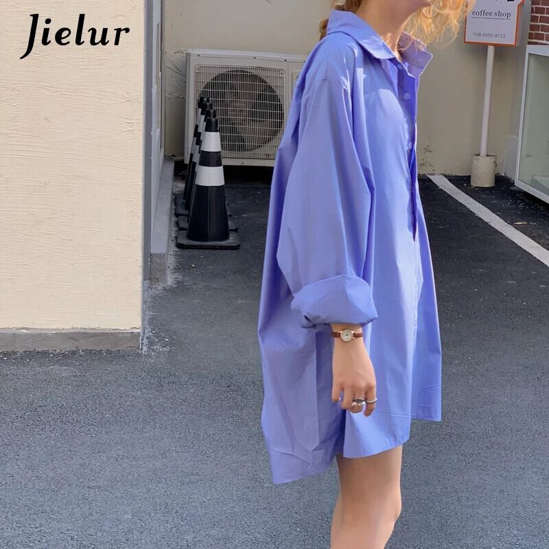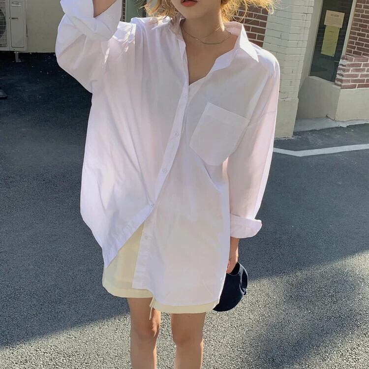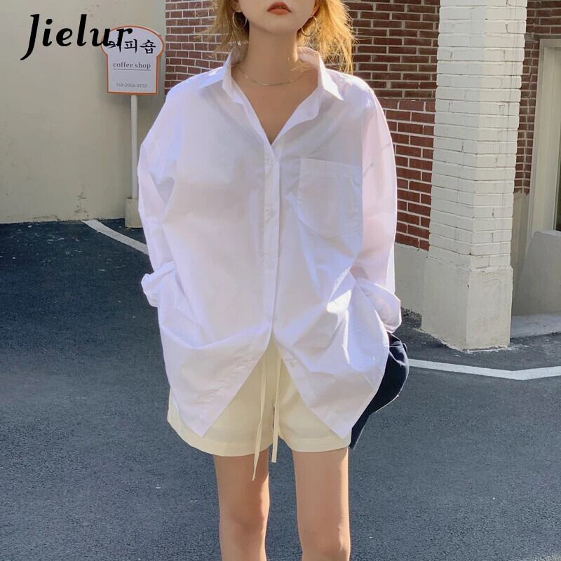送料無料 Jielur ミッドレングス原宿女性シャツルーズブラウスストリートクールボーイフレンド白青シャツポケット S-L ホワイト ブルー かわいい AE12188787888053794681