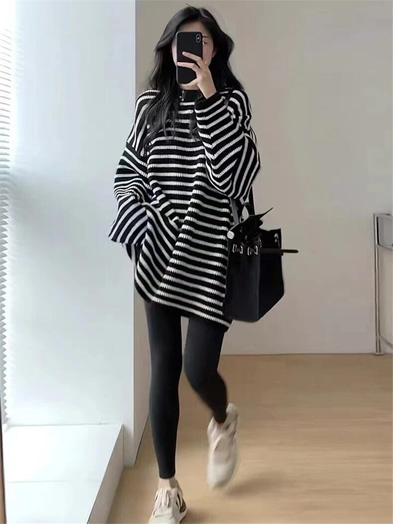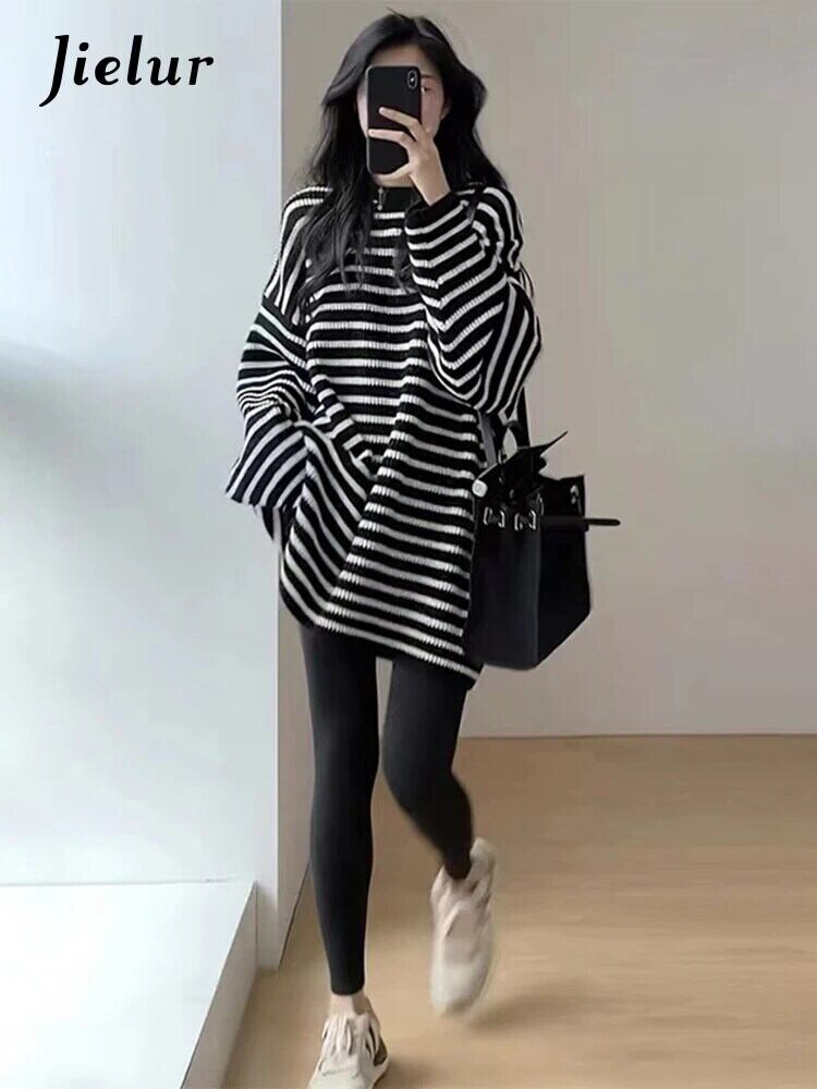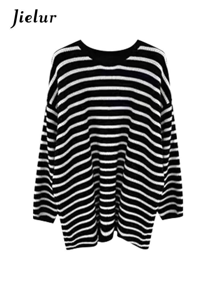 送料無料 Jielur utumn ルーズ Tシャツ女性黒ストリートスリム Chicly Tシャツ女性レトロニットストライプ長袖トップ ロング ブラック AE12188787828331868822