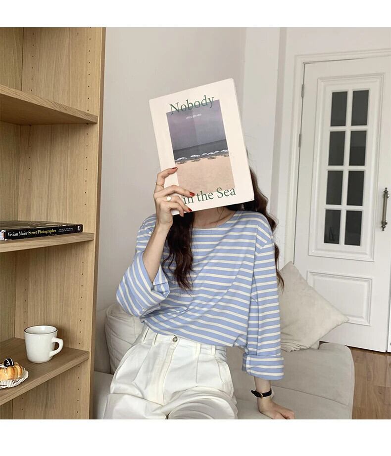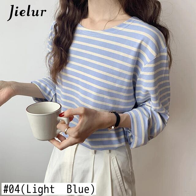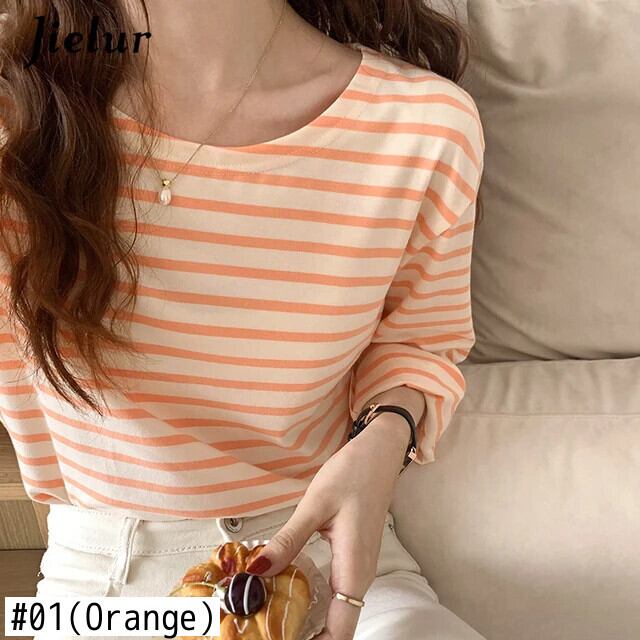 送料無料 Jielur ストライプ Tシャツ秋長袖レディーストップスルーズコットン Tシャツブルーオレンジ S-XL ロング オータム 秋物 AE12188787889151266774