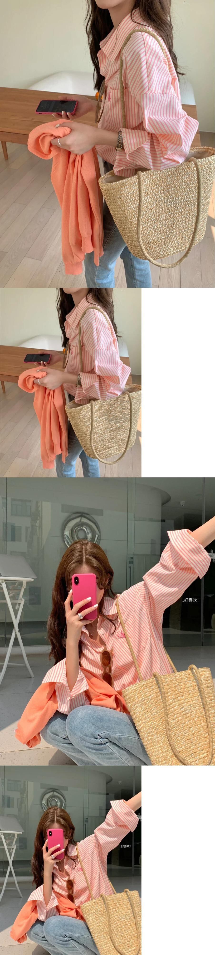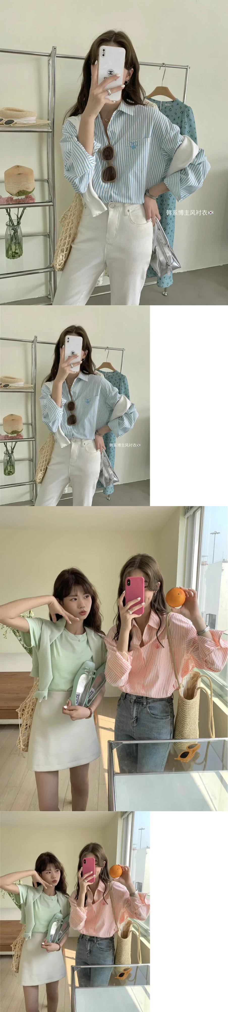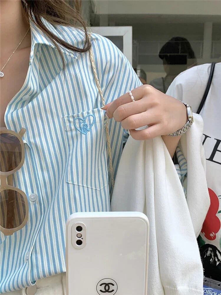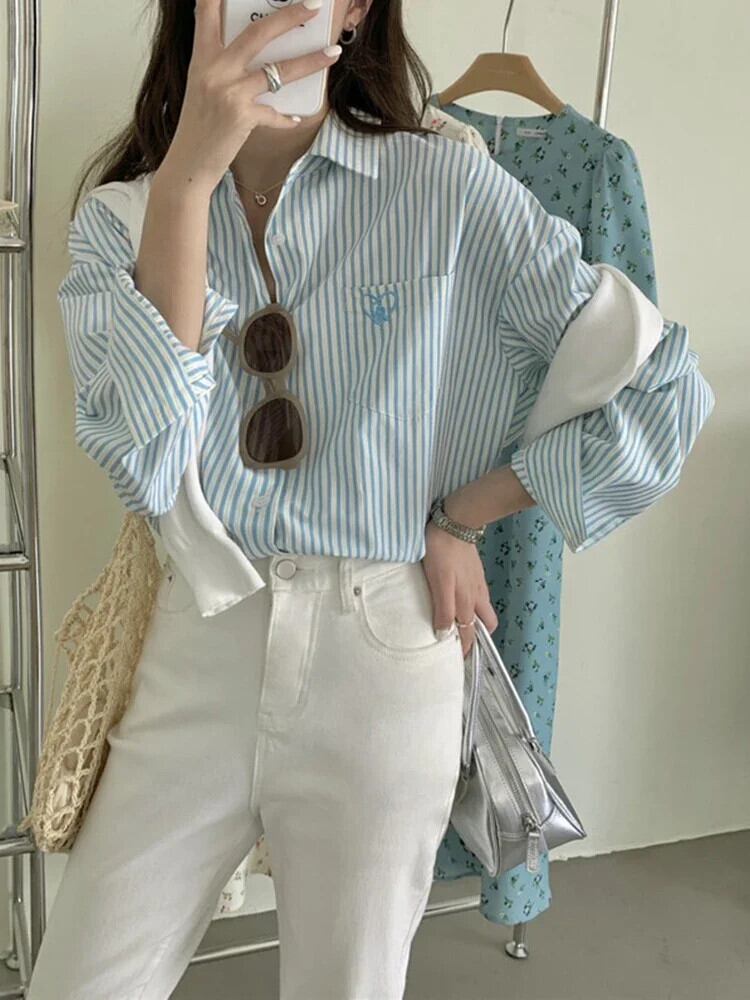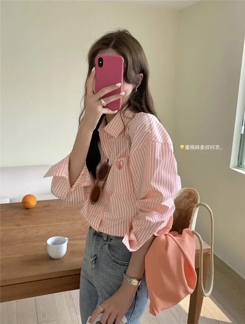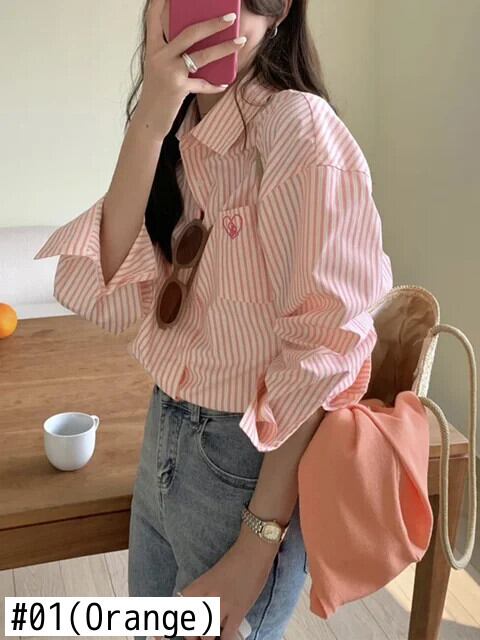 送料無料 春ブルーピンクストライプ刺繍レディースシャツシングルブレストレディースシャツオフィスレディーススタイル レッド スプリング 春物 会社 学校 通勤や通学にも AE12188787885425165363