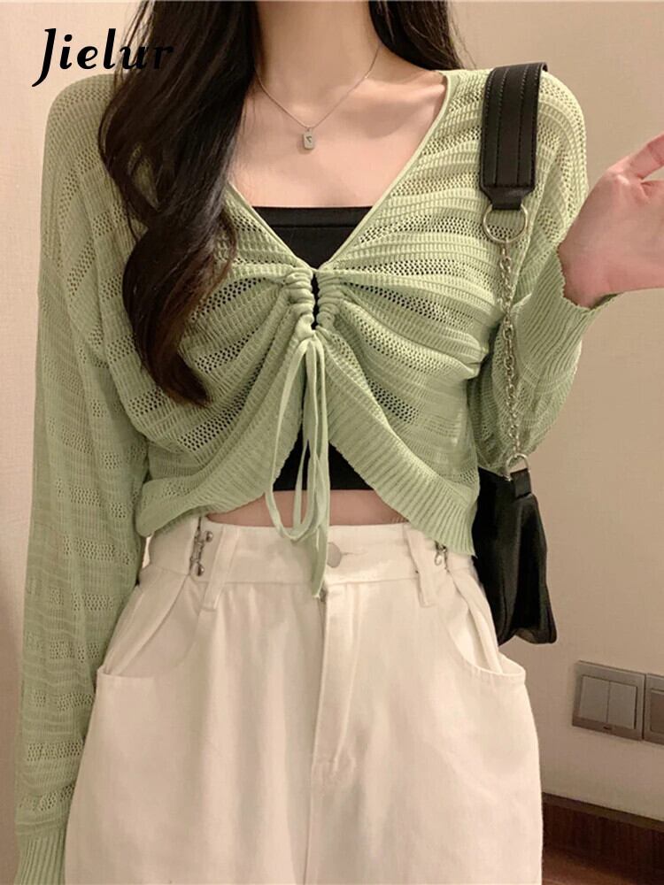 送料無料 Jielur 秋無地スリムカーディガン女性甘い中空アウトカーディガンピンク白緑黒ニットカーディガン女性 ホワイト ブラック 大人ガーリー スウィート キュート カジュアル オータム 秋物 ソリッドカラー グリーン AE12188787815254335406