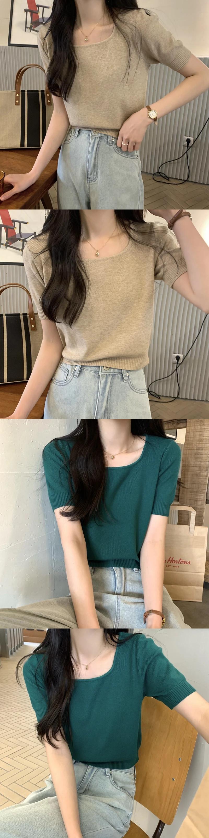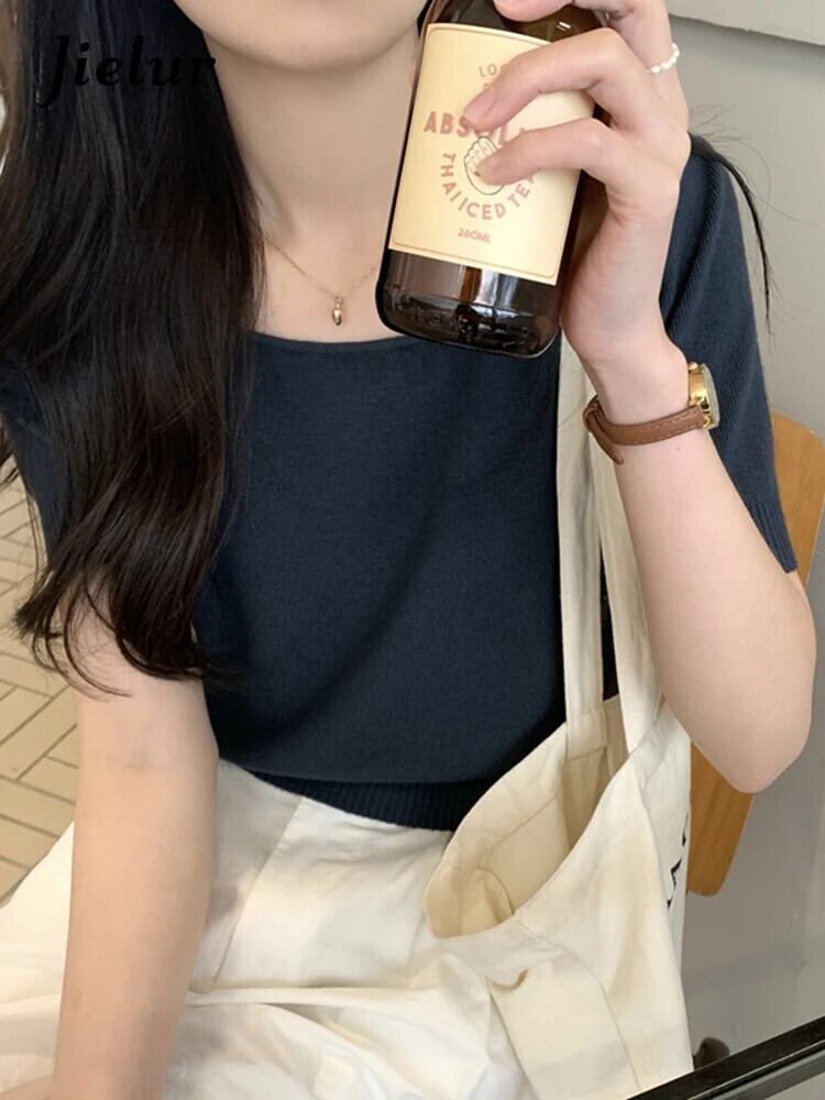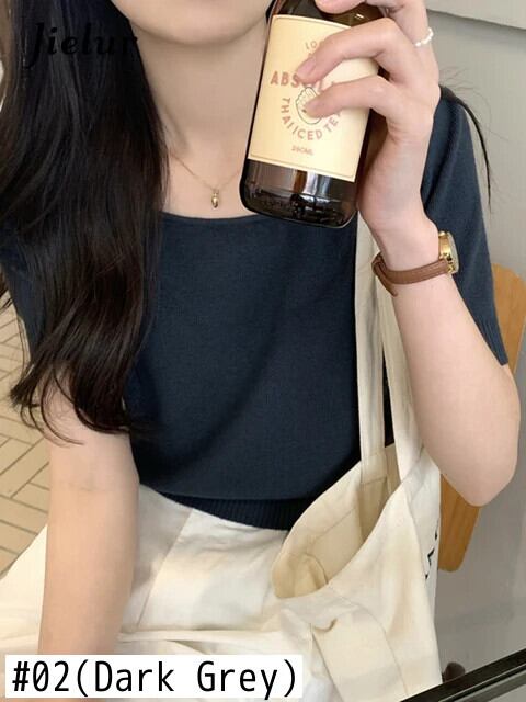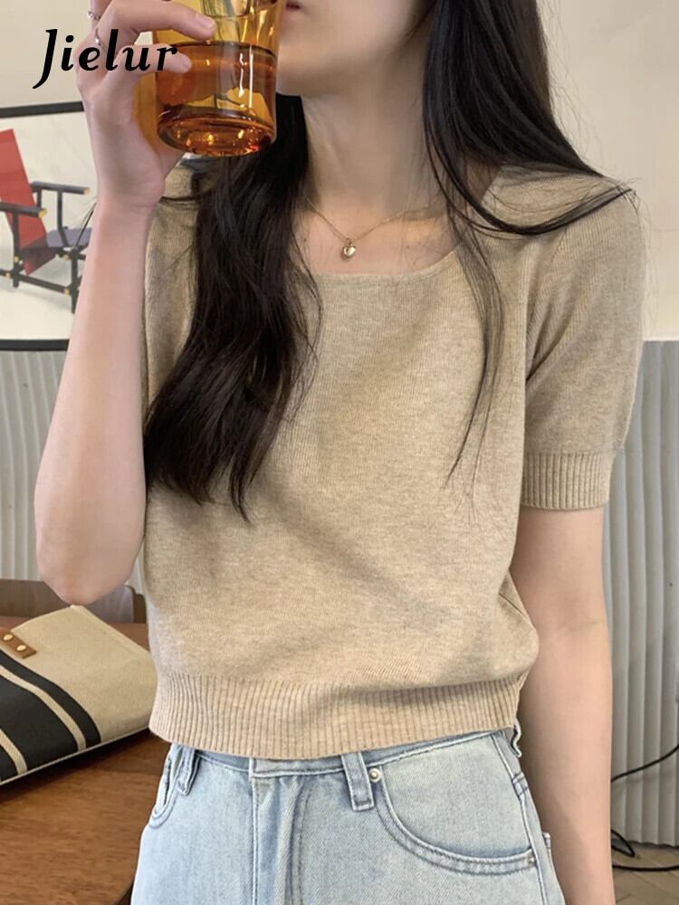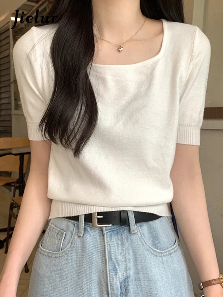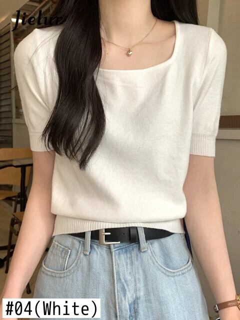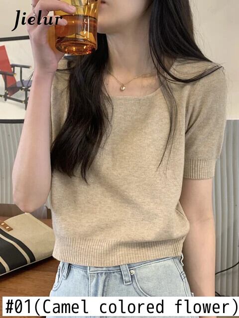 送料無料 Jielur 夏ソリッドカラーニット女性ブラウススクエアネックブラウス甘い黒白アプリコットブラウス ホワイト ブラック 大人ガーリー スウィート キュート カジュアル サマー 夏物 スクウェア AE12188787896940802173