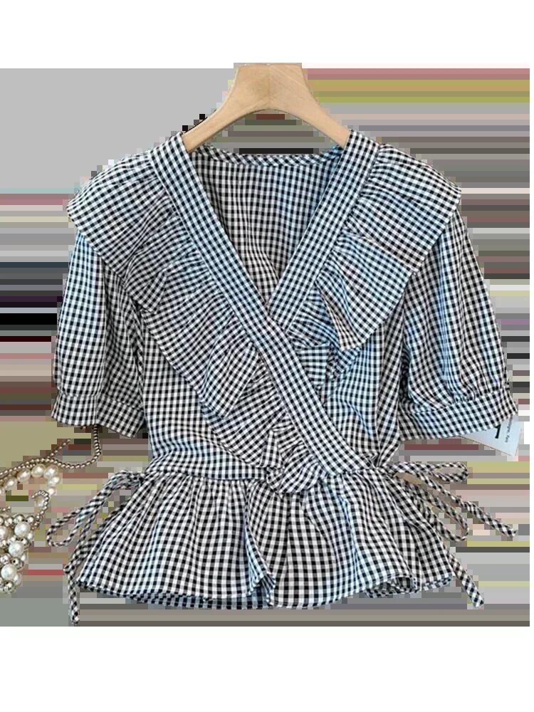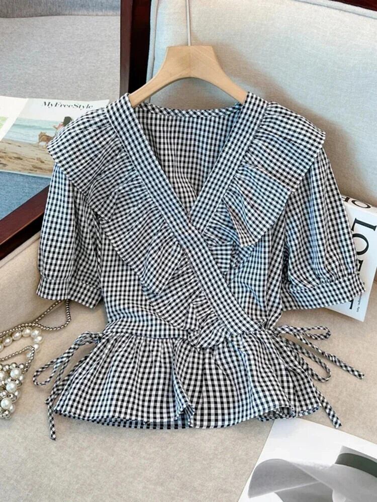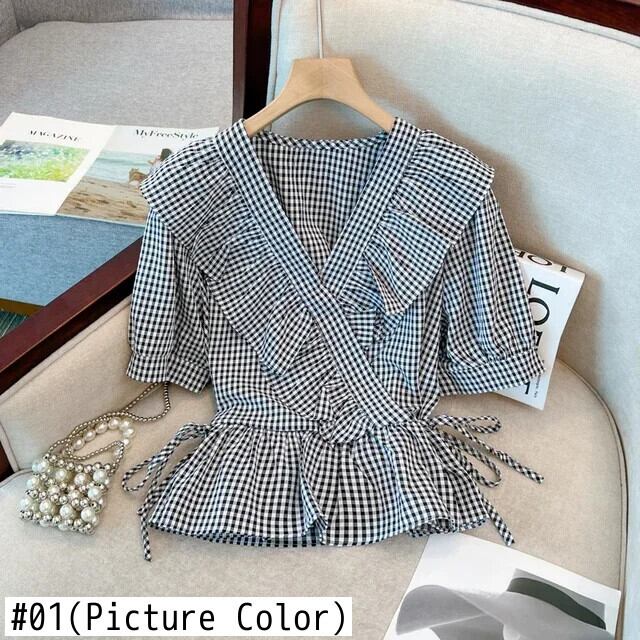 送料無料 スリムウエスト甘い女性ブラウスフリル V ネックパフスリーブブラウスシンプルな若いトップ女性 ラッフル 大人ガーリー スウィート キュート カジュアル Vネック AE12188787856076260054