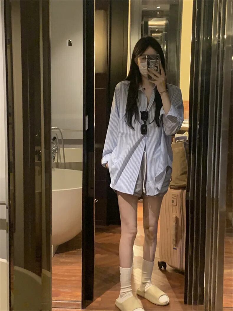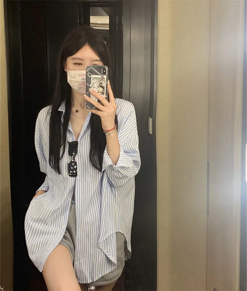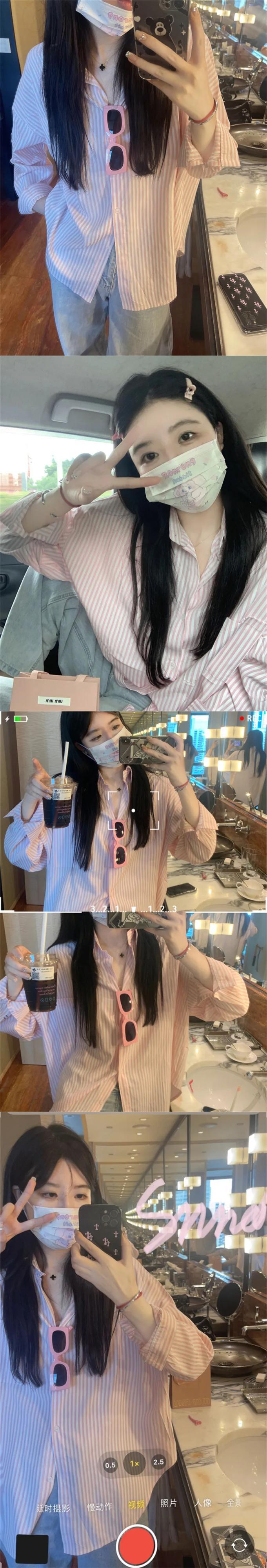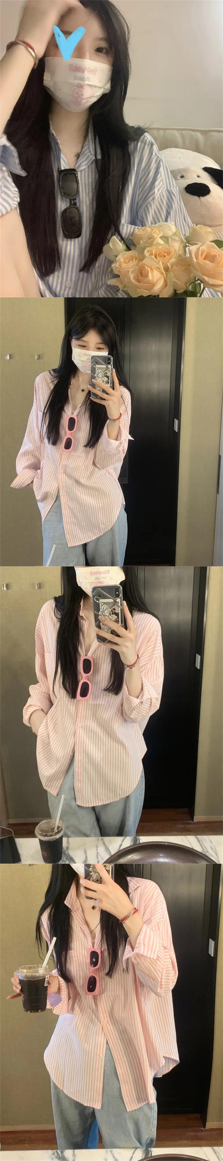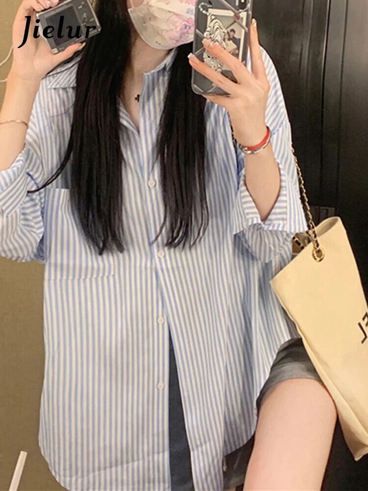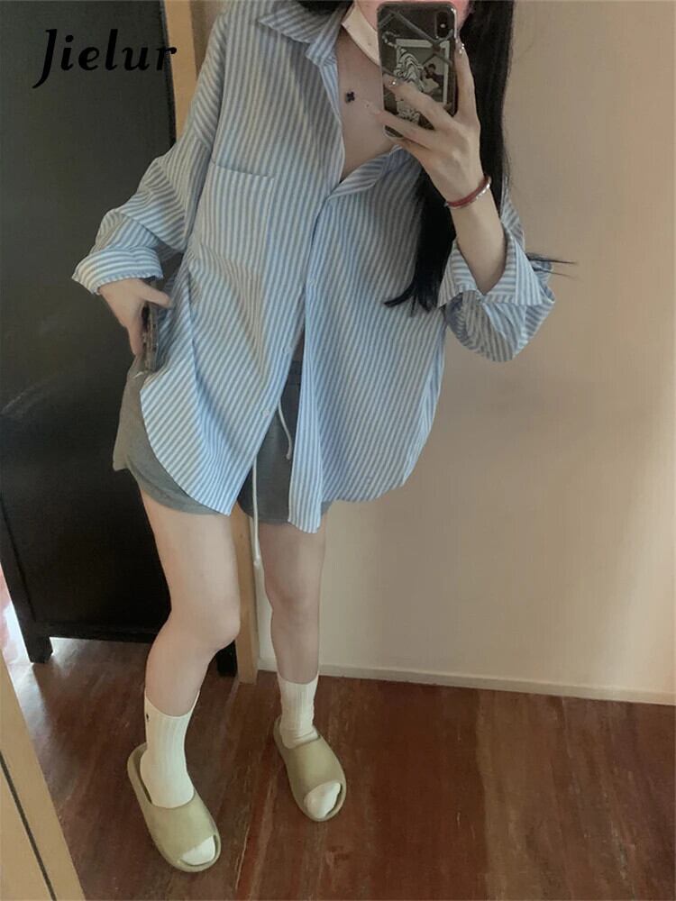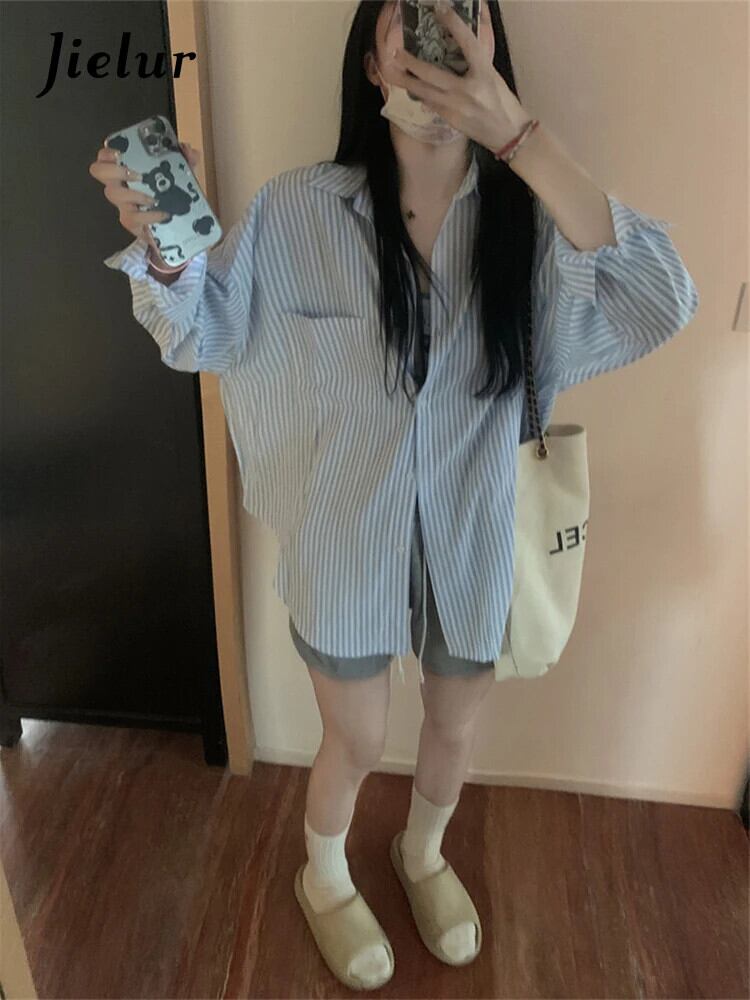 送料無料 Jielur 春ルーズ女性シャツストリートシンプルなベーシック女性シャツピンクブルーストライプ長袖トップ ロング スプリング 春物 AE12188787840991865989
