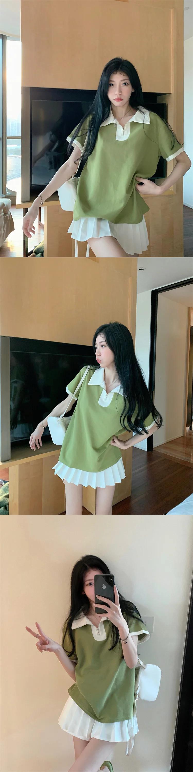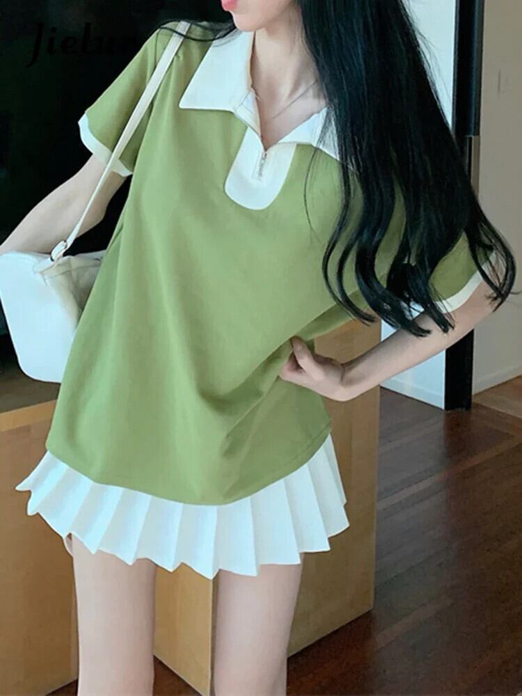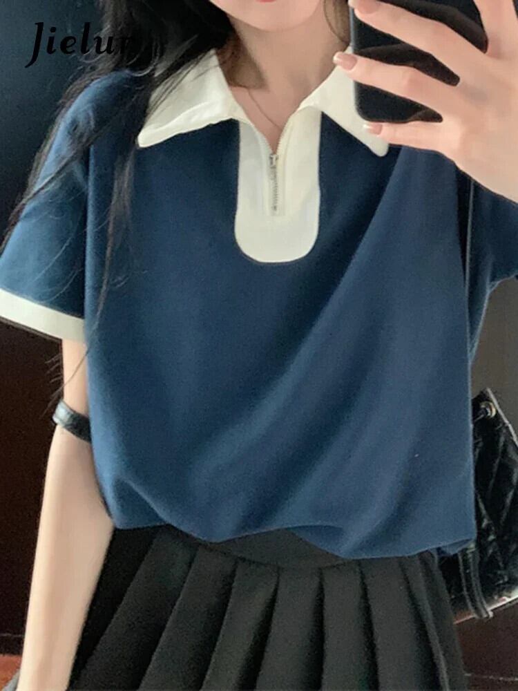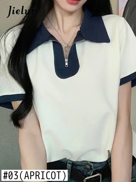 送料無料 Jielur 夏コントラストカラースリムレディース Tシャツルーズストリート Tシャツ黒紫アプリコットポロネックトップ ブラック サマー 夏物 パープル AE121887878472658332