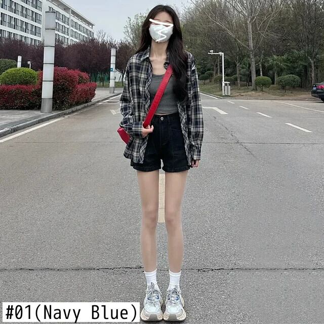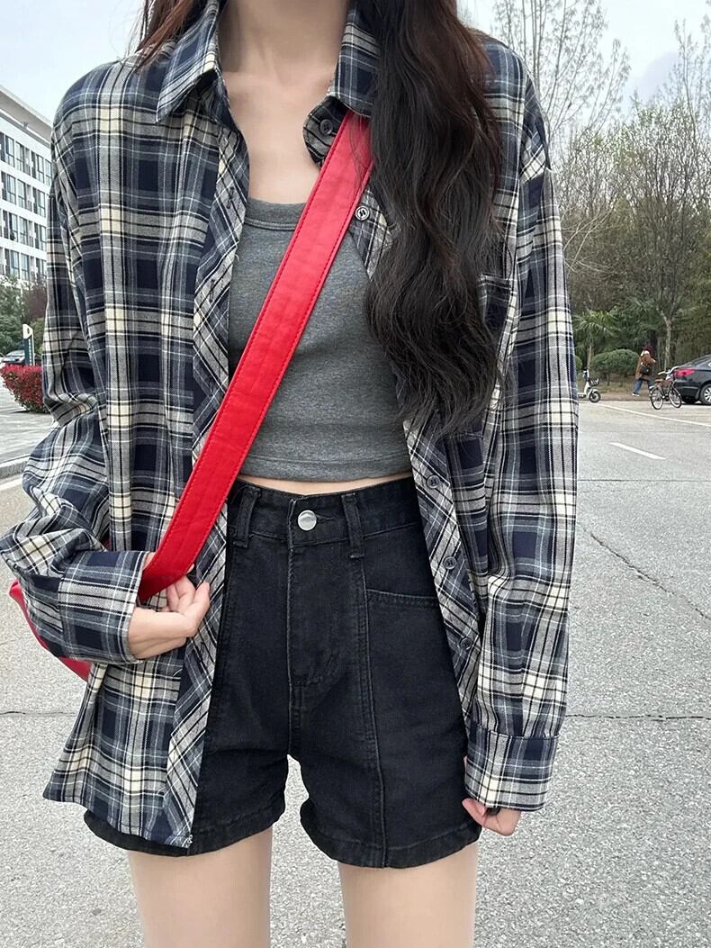 送料無料 Jielur レトロストリートスリムベーシック女性シャツシックにルーズチェック柄女性シャツ春長袖トップ ロング スプリング 春物 AE12188787892475759111