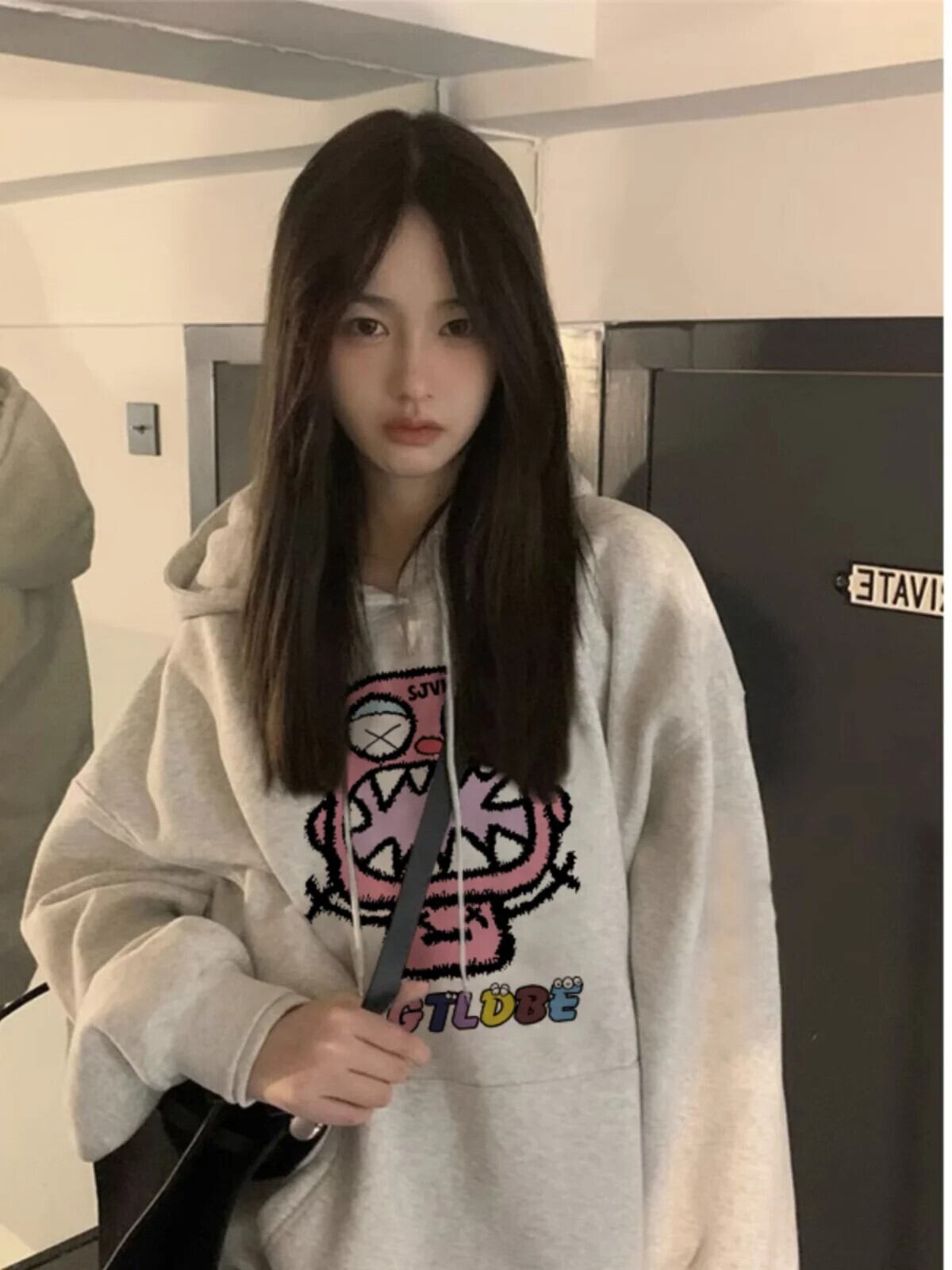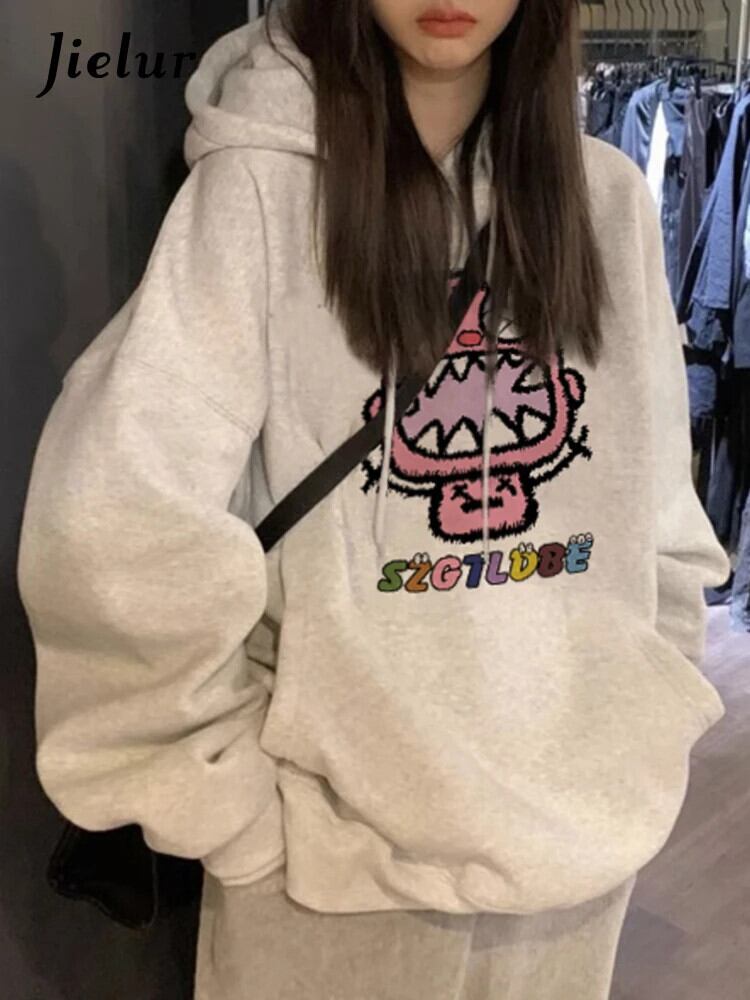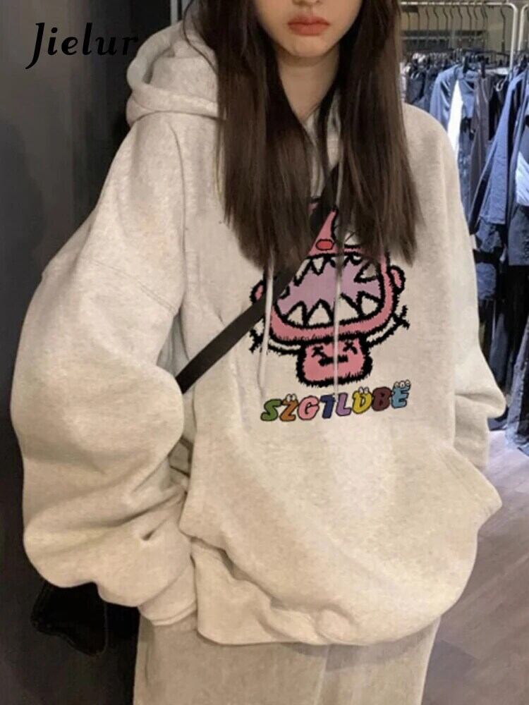 送料無料 Jielur アメリカのかわいい漫画プリントパーカールーズフード付き巾着ベーシックシンプルなストリート女性パーカー 大人ガーリー スウィート キュート カジュアル AE12188787860502855591