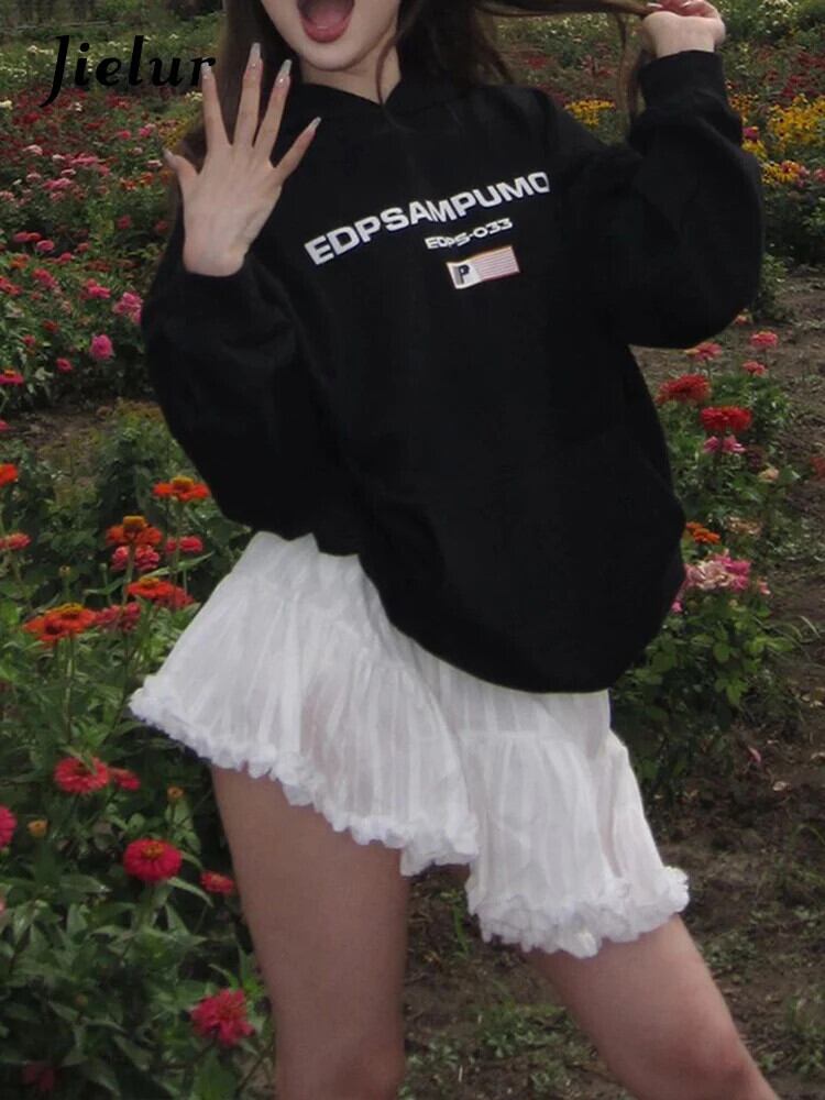 送料無料 Jielur 秋インパーカー女性シンプルベーシックルーズパーカーブラックアメリカンシックな女性トップ オータム 秋物 AE12188787829408233202