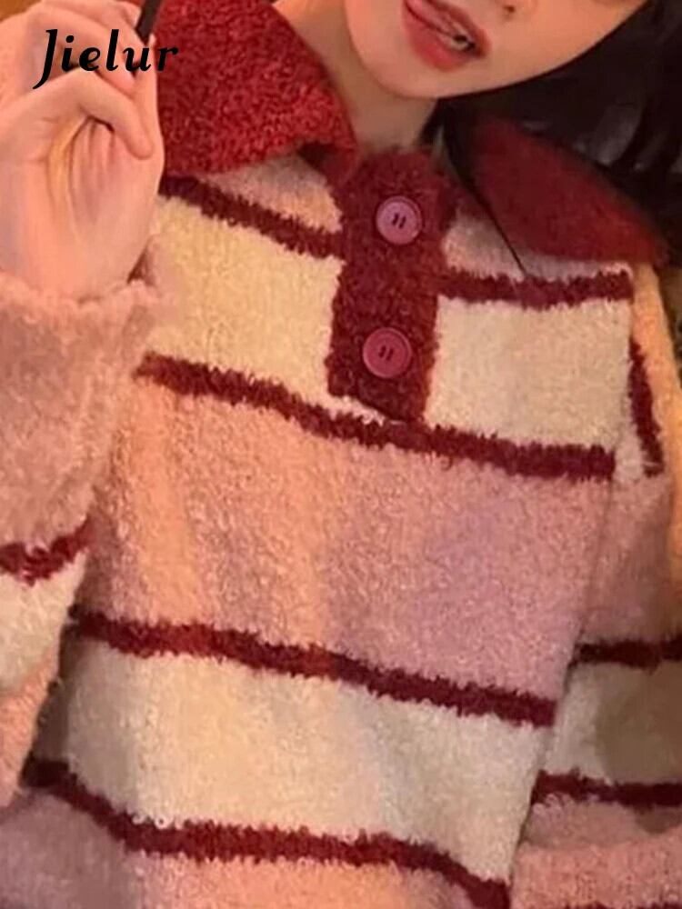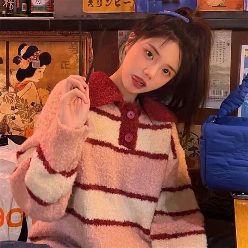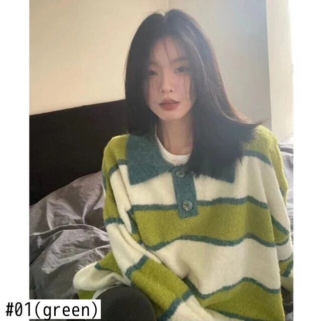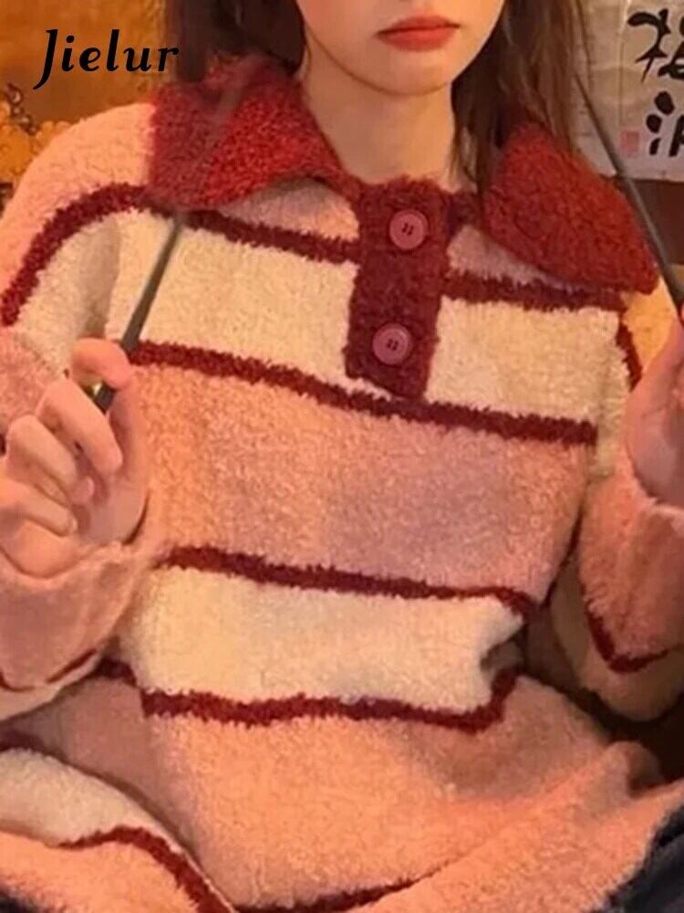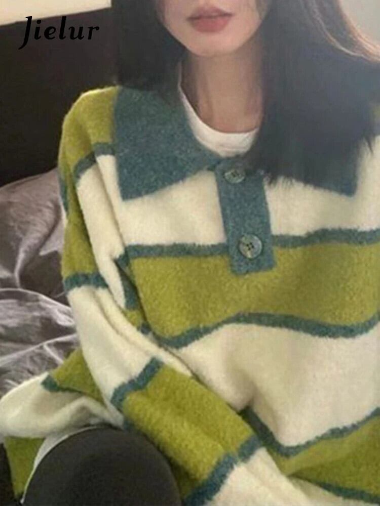 送料無料 Jielur Chicly Polo ソフトスペルカラーストライプ女性プルオーバー冬の甘いルーズセーターニットプルオーバー 大人ガーリー スウィート キュート カジュアル ウィンター 冬物 AE12188787849643031352