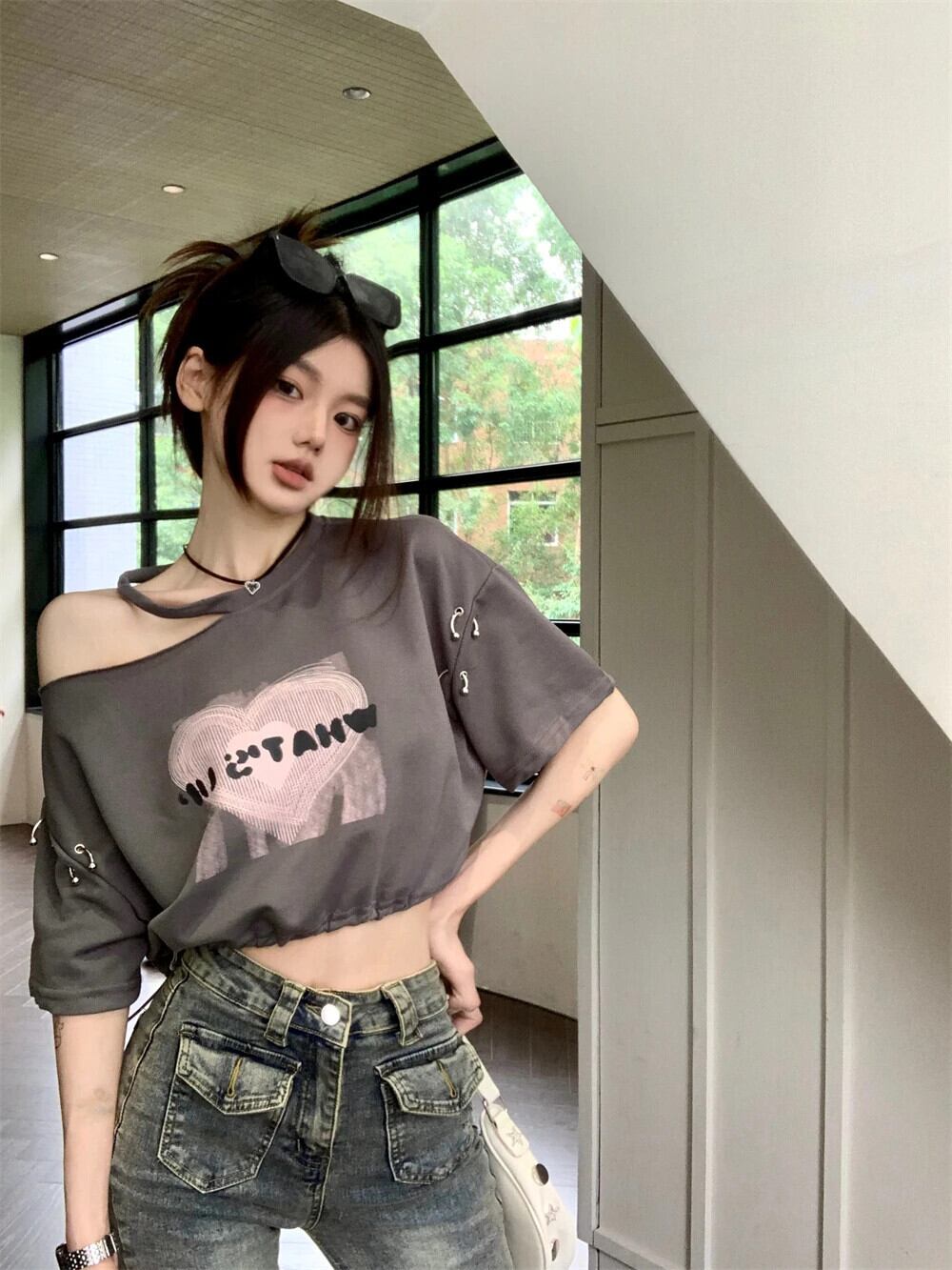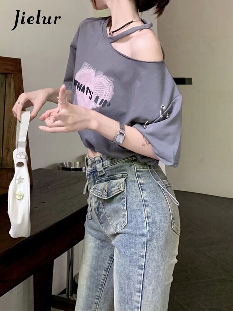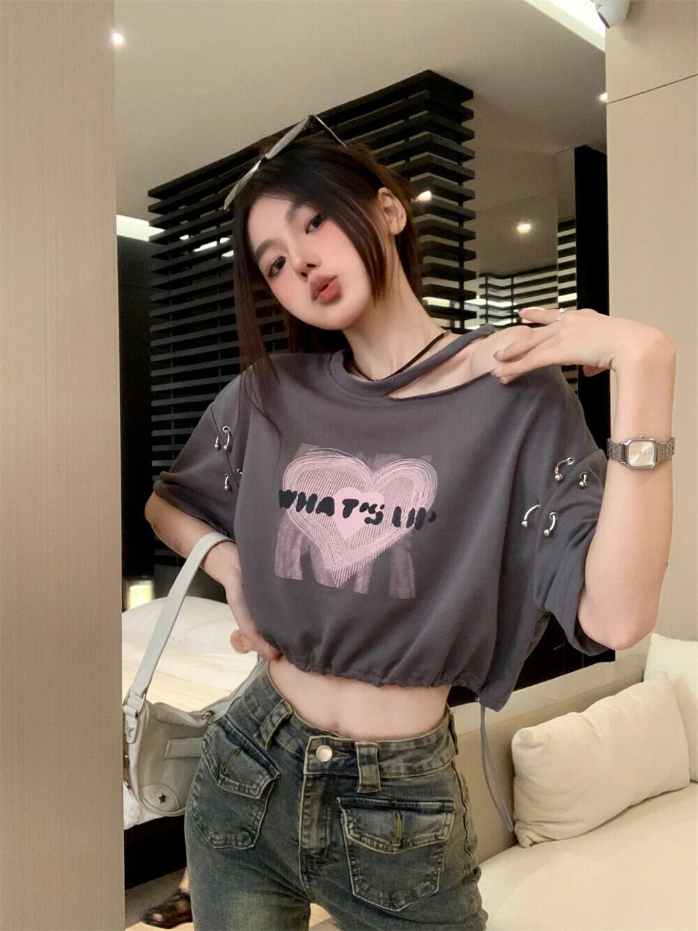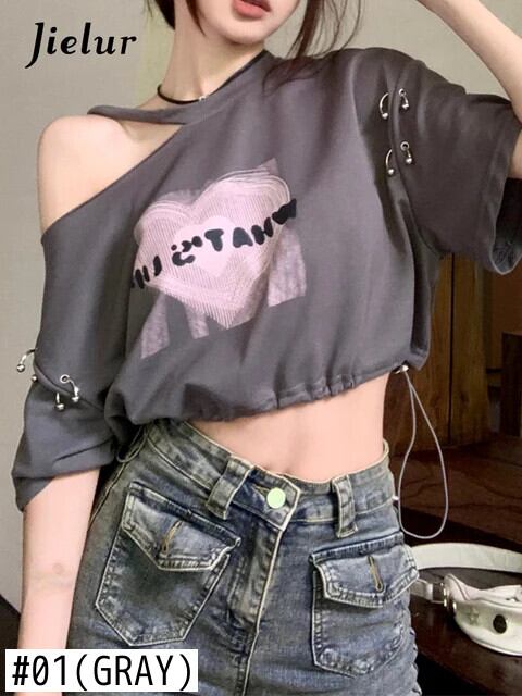 送料無料 Jielur 夏巾着ルーズ女性の Tシャツ若い甘い Tシャツ女性グレーシックなシンプルなベーシックトップ 大人ガーリー スウィート キュート カジュアル サマー 夏物 AE12188787892875726152
