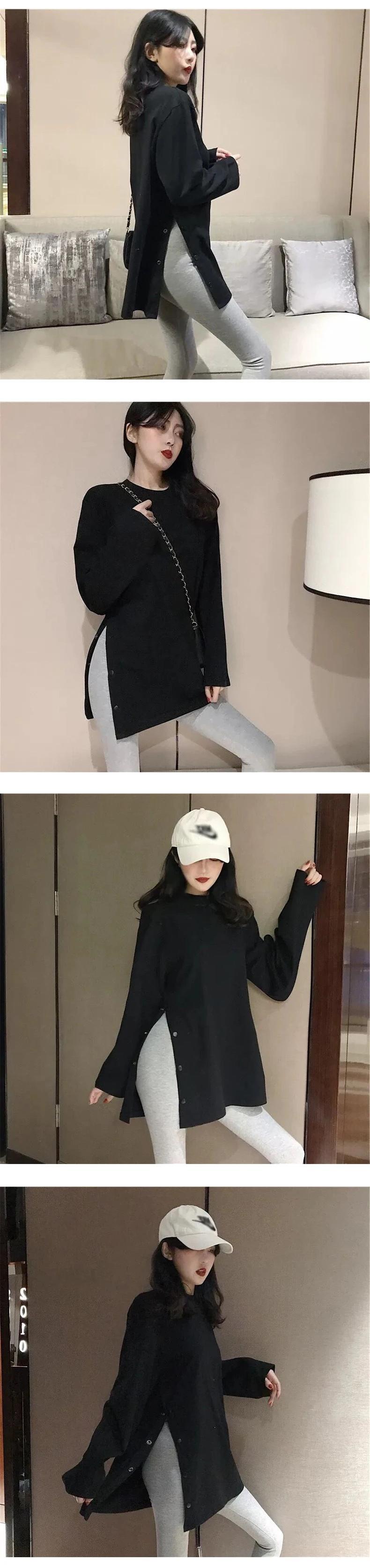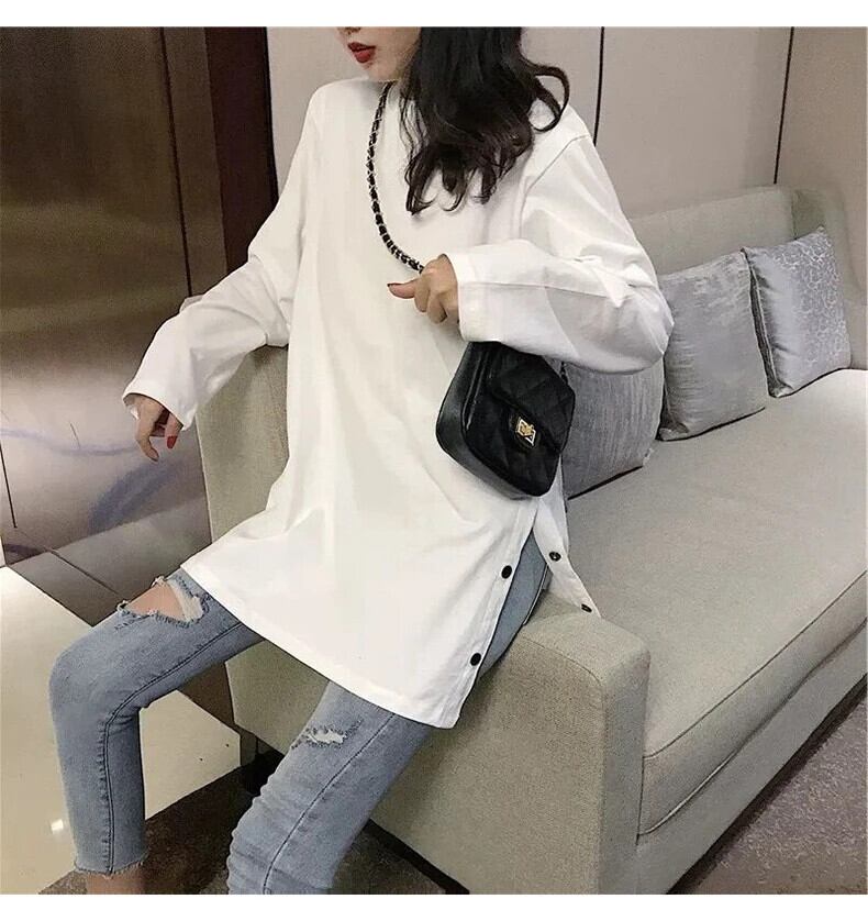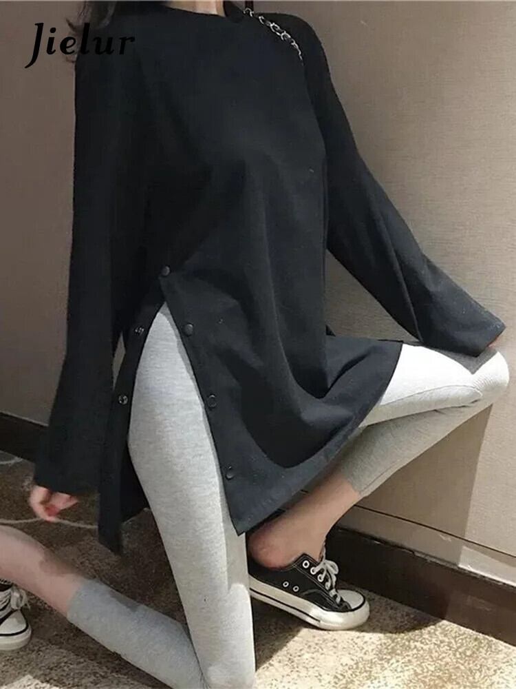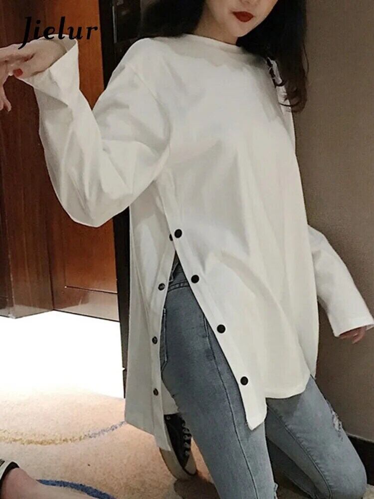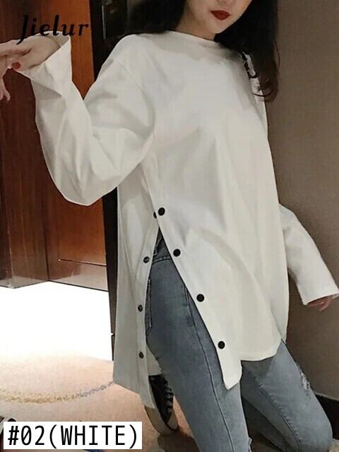 送料無料 Jielur 2022 春スプリットサイドボタン白黒ロング Tシャツ O ネック女性シャツ原宿無地 Tシャツトップス M-XXL ホワイト ブラック かわいい スプリング 春物 Oネック ソリッドカラー AE12188787873821283082
