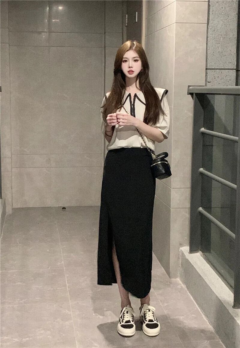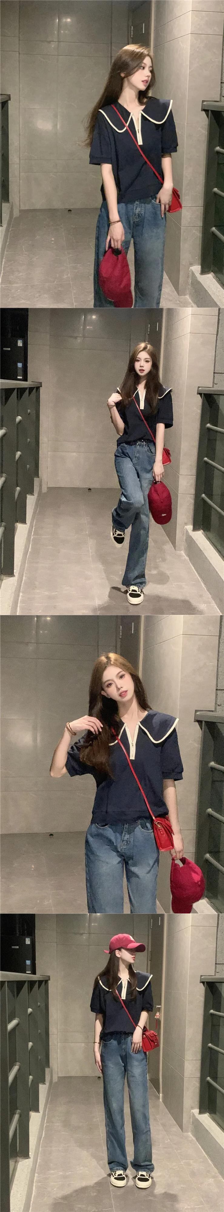 送料無料 Jielur 夏コントラストカラースリム女性の Tシャツ甘いルーズ Tシャツ女性グレーネイビートップ 大人ガーリー スウィート キュート カジュアル サマー 夏物 AE12188787877785053041
